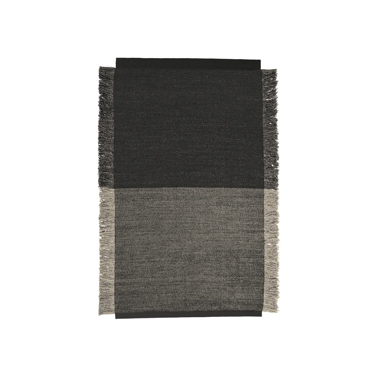 De Fringe vloerkleed van Kvadrat bekoort door zijn grijze kleurenpalet: door felgekleurde wolgarens te weven met twee verschillende grijstinten - een donkere antracietkleur en een lichtere rookkleurige tint - is het resultaat zowel opvallend als ingetogen, waarbij accentkleuren samensmelten met twee monochrome blokken.