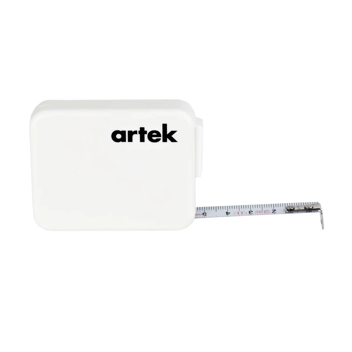 Het meetlint van Artek verschijnt in een eenvoudige, witte metalen kast met een zichtbaar merklogo. De totale lengte van 3 meter maakt het meetlint van Artek geschikt voor kleine en grote oppervlakken.
