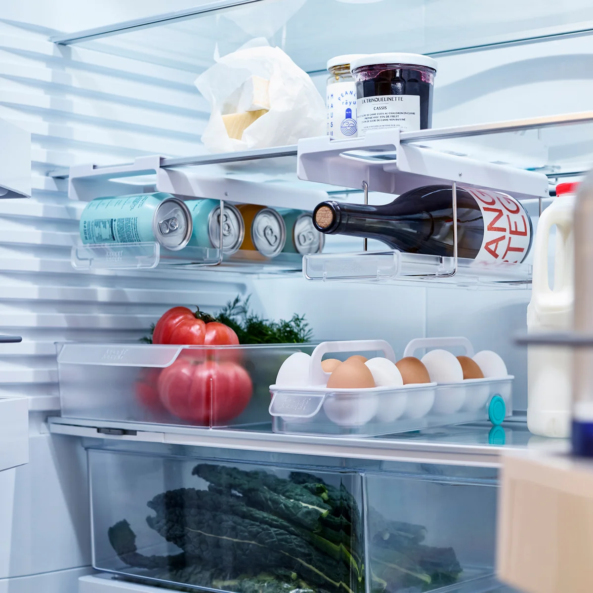 Een ander praktisch kenmerk is het ruimtebesparende ontwerp: als ze niet worden gebruikt, kunnen de houders eenvoudig worden ingeklapt zodat de ruimte eronder nog steeds kan worden gebruikt. Zo blijft de koelkast flexibel en opgeruimd.