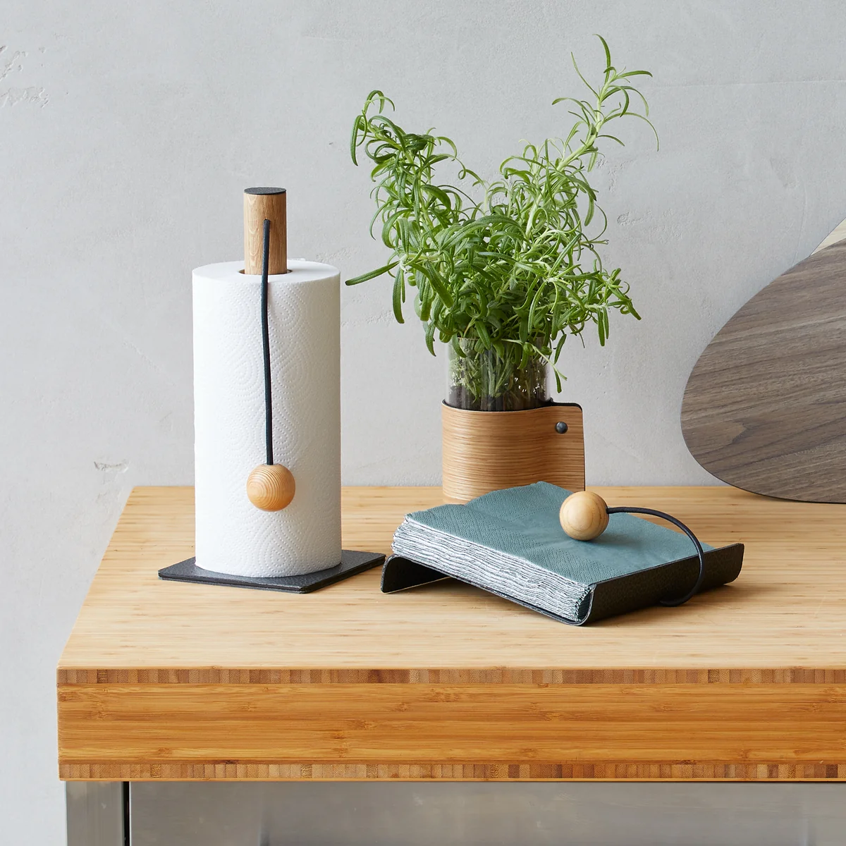 De String keukenrolhouder van Lind DNA overtuigt door zijn decoratieve uiterlijk en de speelse bal die voorkomt dat de keukenrol afrolt. Naast het fornuis maar ook op de eettafel is de keukenrolhouder bijzonder praktisch. De eikenhouten bal houdt de rol op zijn plaats.