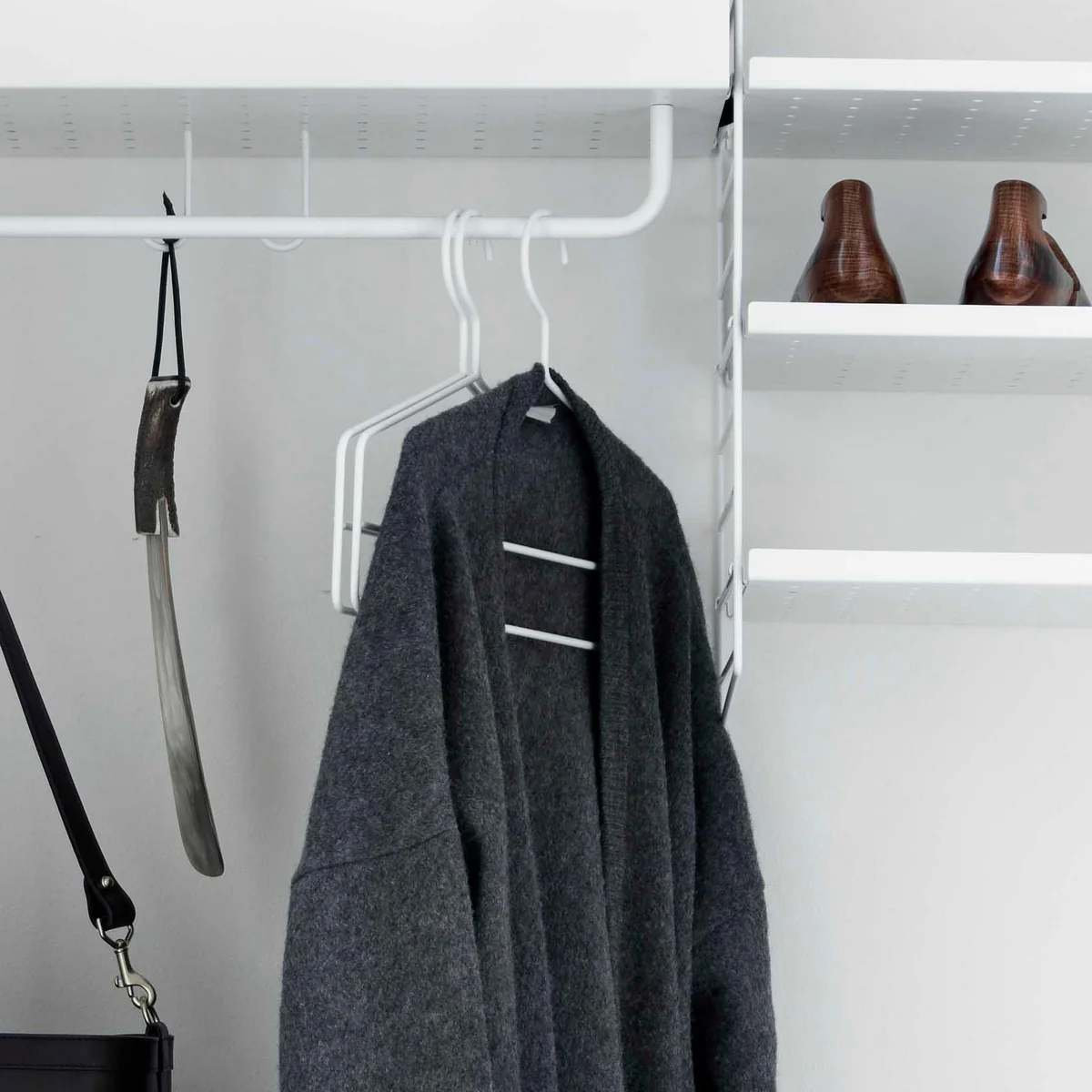 Kledingstangen en haken kunnen String in een handomdraai worden omgetoverd tot een garderobe die ieders aandacht trekt in de gang. Met de bijpassende kleerhangers, die perfect bij het rekkensysteem passen, kunnen jassen, sjaals en jacks netjes en zichtbaar aan de kapstok worden opgeborgen. Het spreekt voor zich dat de String Het rek kan ook worden gebruikt om een garderobesysteem te maken waarin de kleerhangers worden gebruikt. Een extra tweede stang houdt broeken en rokken kreukvrij.