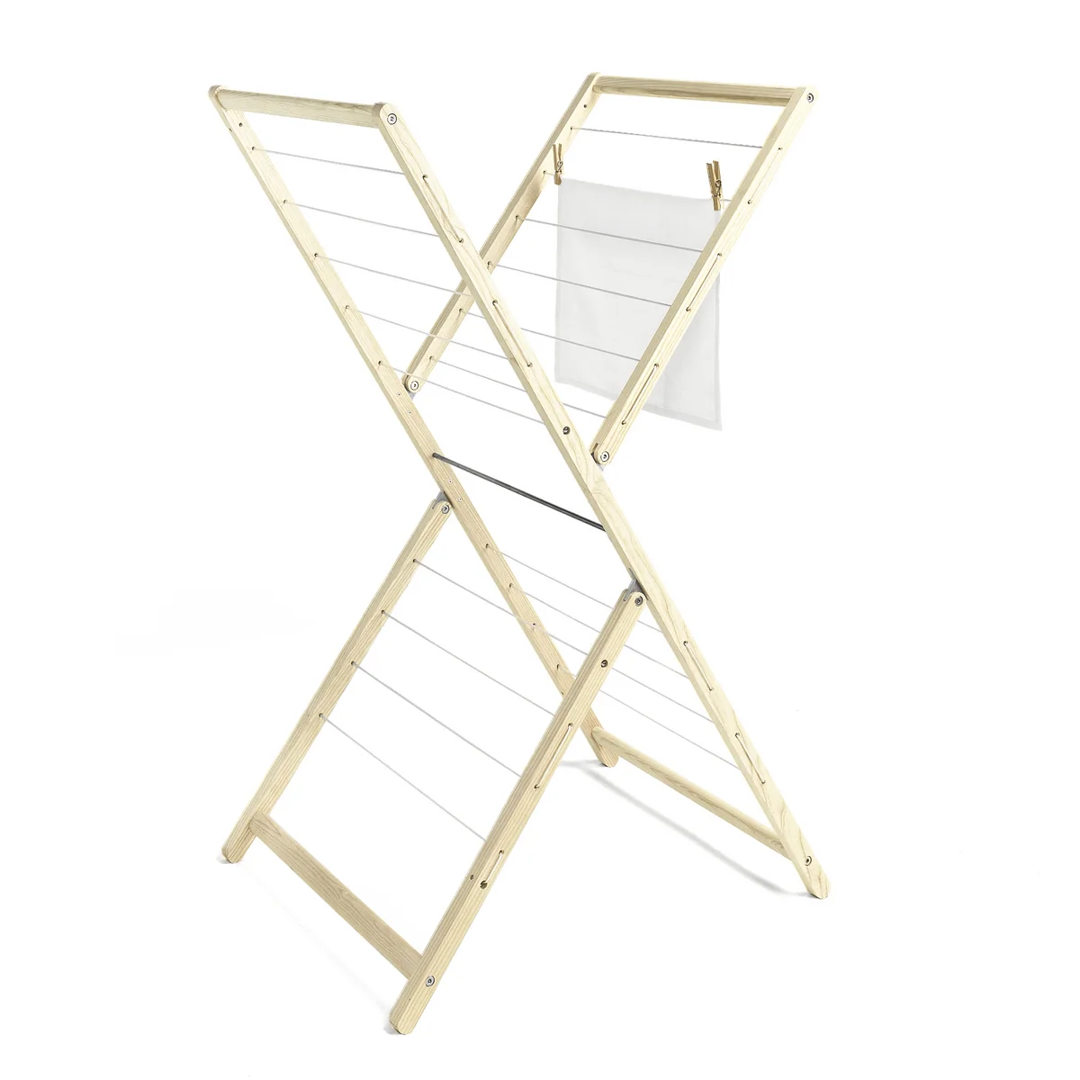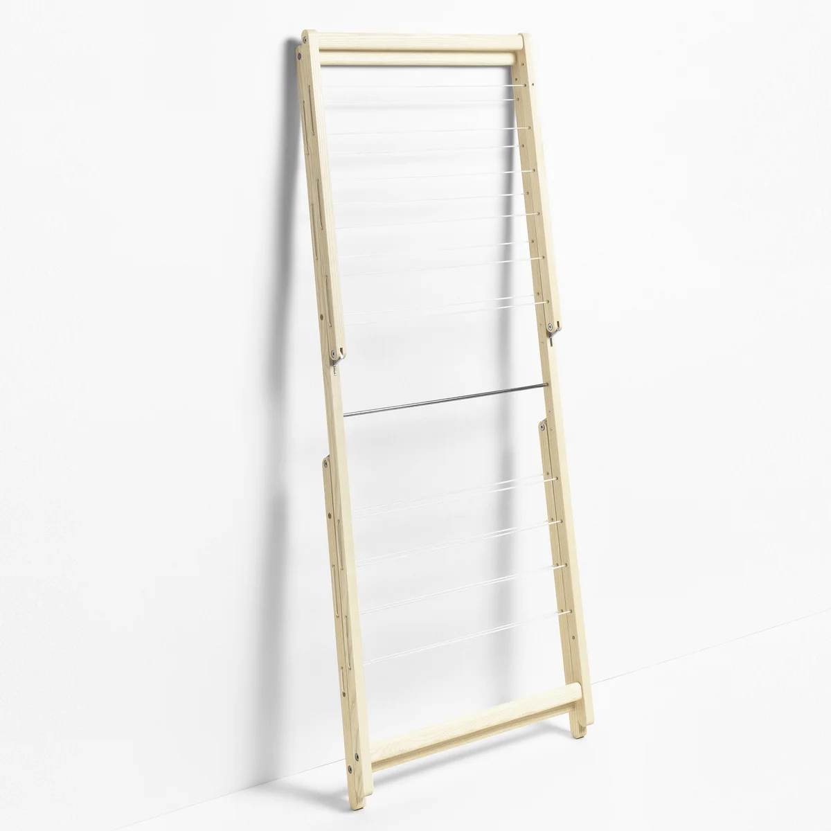 In plaats van ruimte in te nemen naar de zijkanten, gaat het omhoog, waardoor het zeer nuttig is in kleine flats. Het lichte en stabiele kledingpaard van massief essenhout kan snel en eenvoudig worden opgevouwen en uitgeklapt.