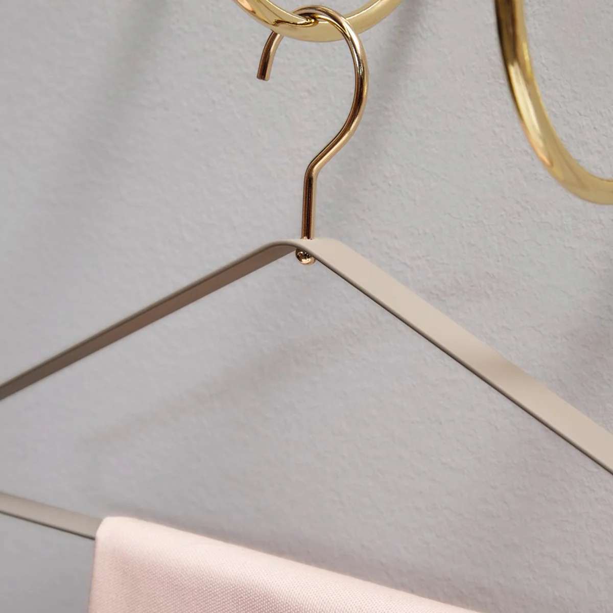 De Vestis kleerhangers van AYTM kenmerken zich door hun gedetailleerde, edele vormgeving, die elke garderobe stijlvol opfleurt. De hangers, gemaakt van ijzer, zijn van bijzonder hoge kwaliteit en stabiel en zijn daarom bestand tegen zelfs zware winterjassen. Het oppervlak is mat afgewerkt zodat lichte blouses en jurken niet van de hanger afglijden maar op hun plaats blijven. Terwijl de hanger een matte afwerking heeft, heeft de haak een glanzend oppervlak gekregen, wat zorgt voor een harmonieus contrast.