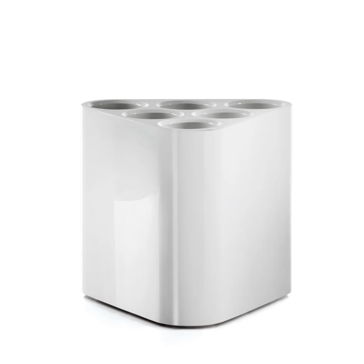 Het Italiaanse bedrijf Magis produceert de eenvoudige en functionele paraplubak in glanzend gekleurde ABS-kunststof. Het kunststof materiaal is robuust en kan zelfs de natste paraplu weerstaan.