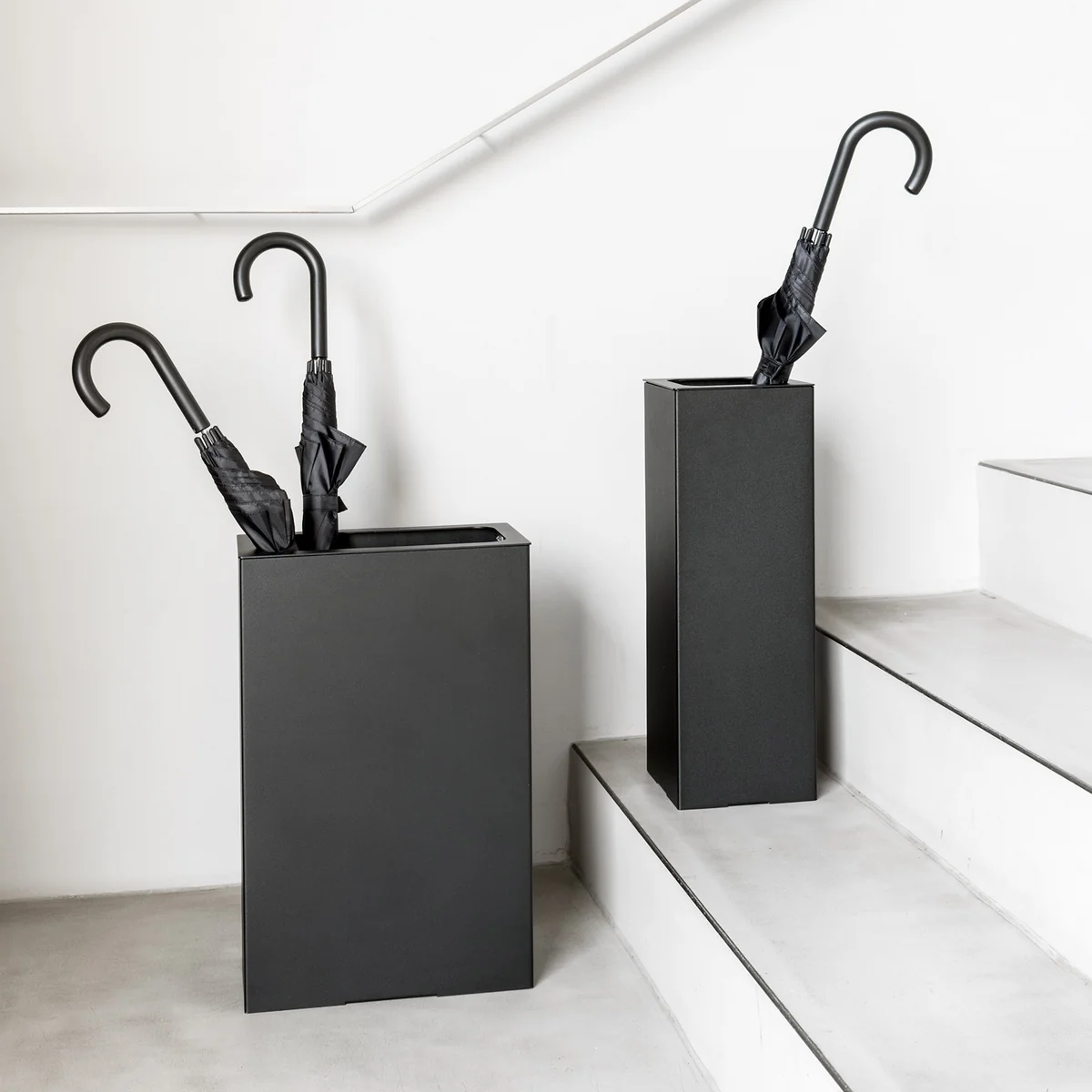 De paraplubak is gemaakt van naadloos gelast staal met een zwarte poedercoating. De stand is zowel in een vierkante als in een smalle rechthoekige uitvoering verkrijgbaar. Zo is er voor elke interieurstijl en smaak de juiste stand.