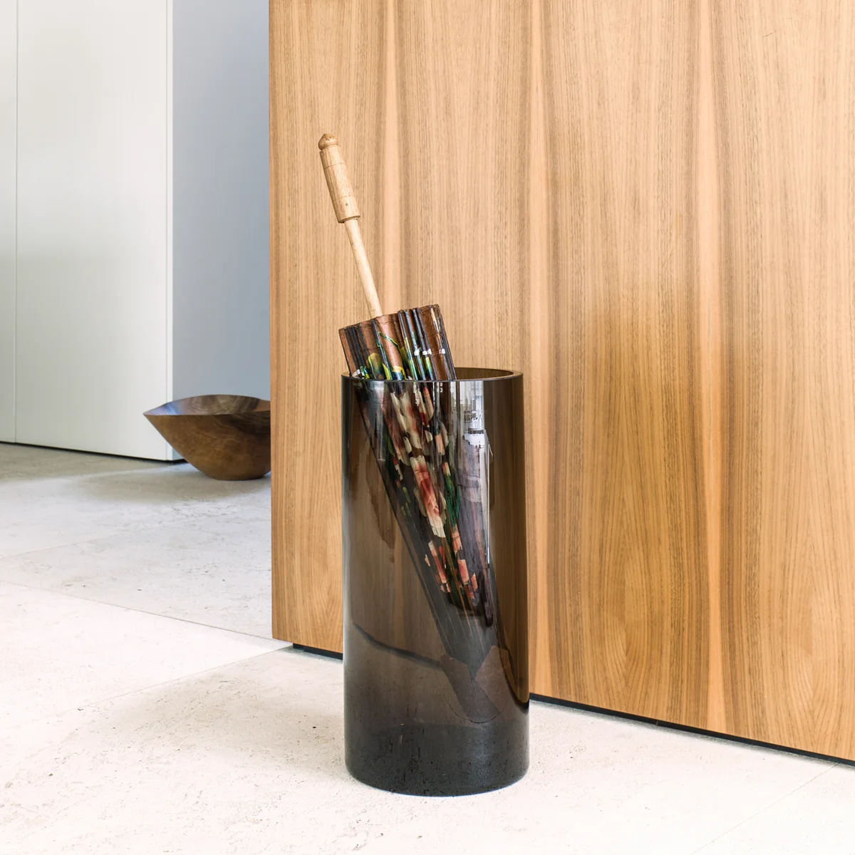 De parapluhouder 0510 van Schönbuch is een cilindervormig statief van mondgeblazen glas voor paraplu's. Het kan ook net zo makkelijk gebruikt worden als een stijlvolle bloemenvaas voor op de vloer. Direct naast de kapstok, de schoenenkast of de voordeur wordt de paraplubak een tijdloos en elegant designobject.