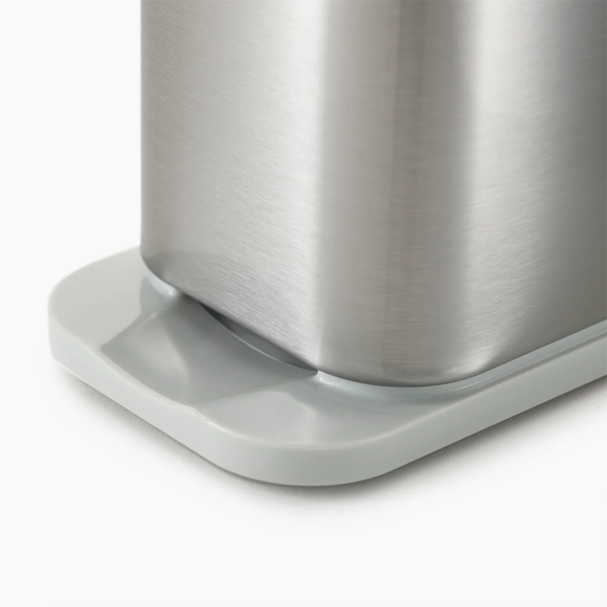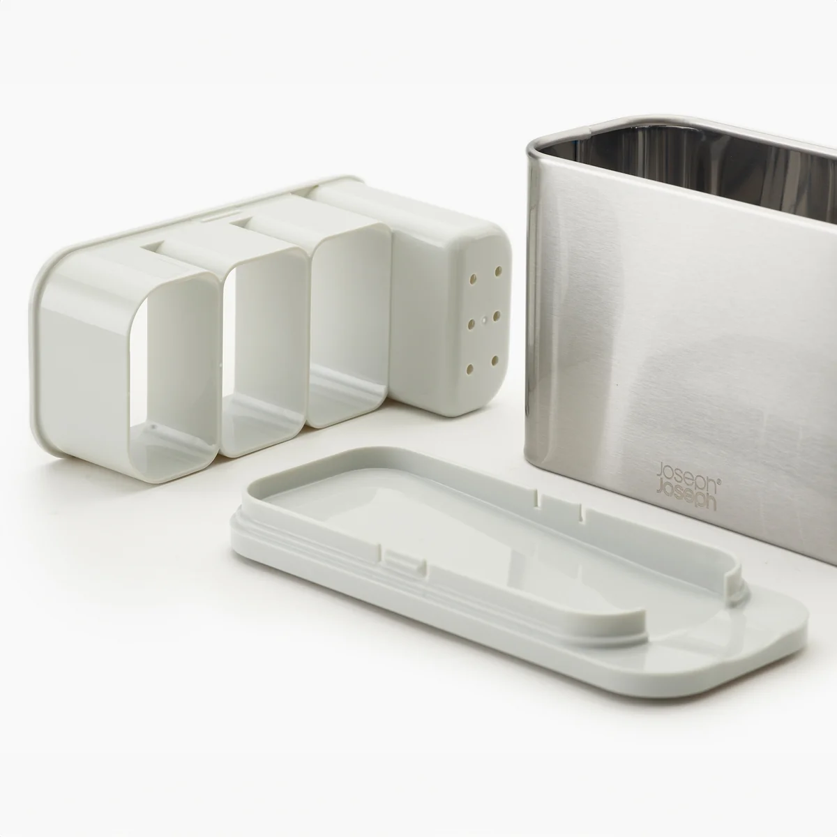 De Surface afdruiprek voor bestek maakt deel uit van een reeks roestvrijstalen organisers voor de gootsteen van Joseph Joseph . De bak maakt het mogelijk om bestek direct na het wassen uit te lekken en netjes op te bergen.