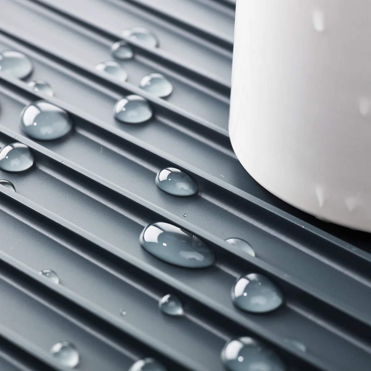 De grote container aan de zijkant is voor het bestek. Zo passen gerechten van maximaal vier personen op het Y-rack en nemen ze zo min mogelijk ruimte in. Het oppervlak van de antislipbasis is voorzien van schuine ribben die het afvoerwater in de gootsteen leiden.