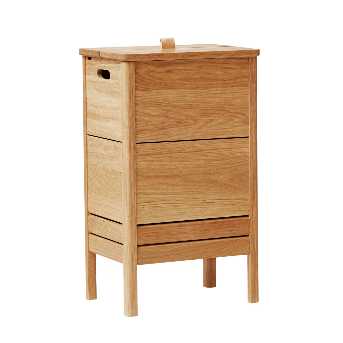 De A Line wasmand van Form & Refine is een mooie wasmand die volledig van hout is gemaakt en indruk maakt met praktische functies: het deksel kan worden opgetild met een lus van leer en blijft open om de kist te vullen met wasgoed. Twee sleuven in de wasmand zorgen ervoor dat het wasgoed goed geventileerd blijft. De handgrepen aan de zijkant maken de wasmand handig om door het huis te vervoeren. Dankzij de laag uitgesneden poten van de mand, brengt de mand een elegante lichtheid in de kamer.