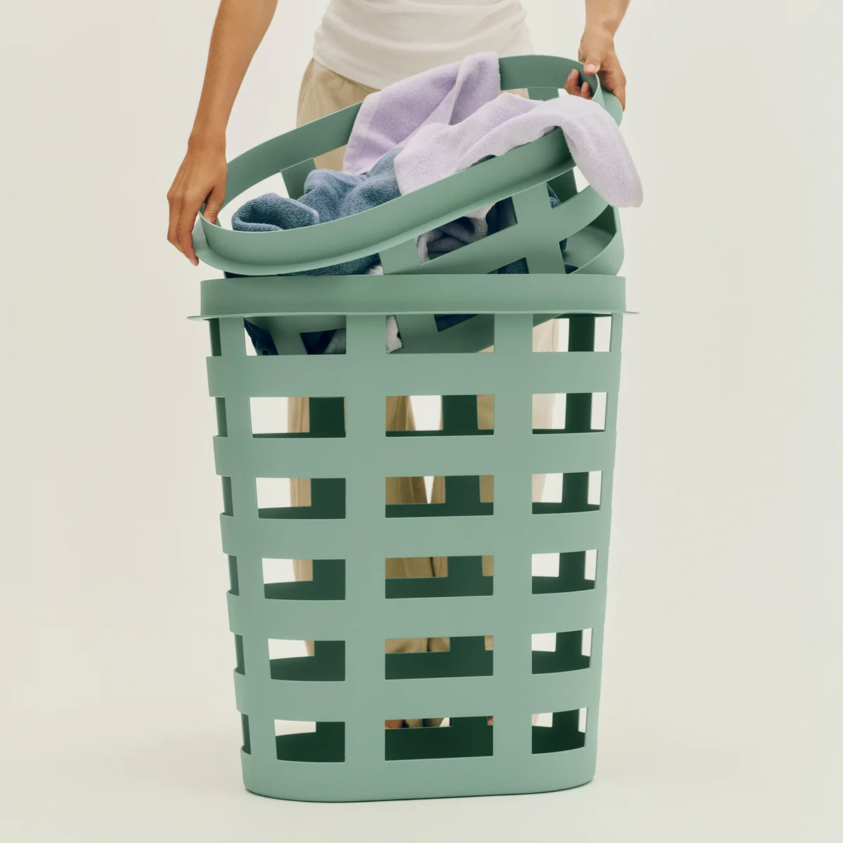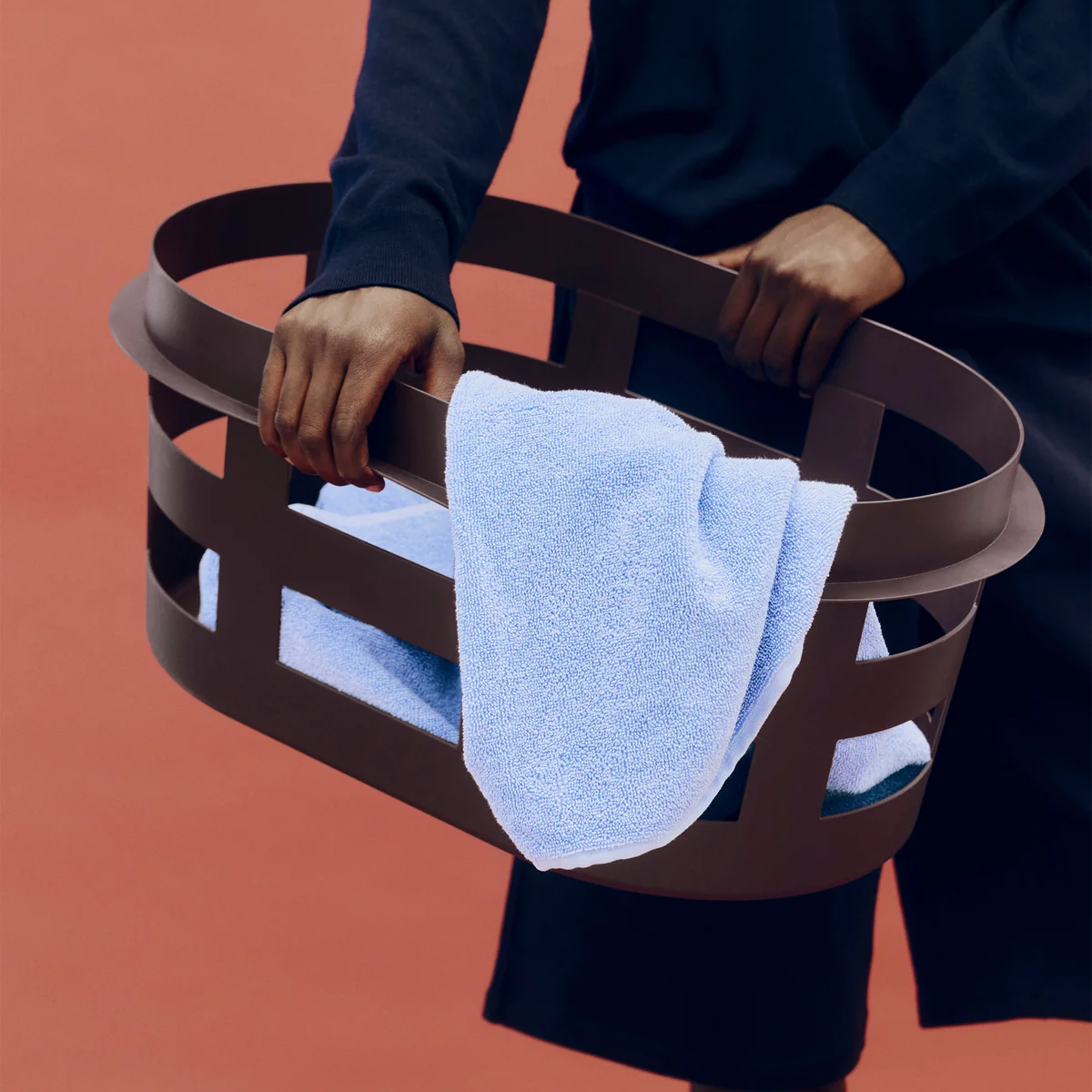 De Basket opbergmand van HAY heeft een decoratieve geweven look en kan meer dan alleen vuile was opbergen. De mand van het Big Game designteam is gemaakt van gerecycled plastic en voorzien van uitsparingen. De mand is ontworpen om te ademen, zodat vochtig wasgoed, handdoeken en ander textiel gemakkelijk kunnen drogen.