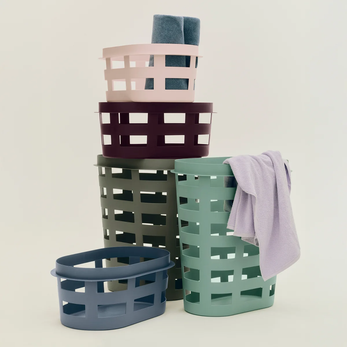 Als echte allrounder biedt de mand niet alleen plaats aan HAY mand niet alleen wasgoed opbergt, maar bijvoorbeeld ook gebruikt kan worden in de keuken, waar de kleine versie bijzonder geschikt is voor het opbergen van groenten en fruit. Hij kan ook worden gebruikt in de kinderkamer of studeerkamer om speelgoed of kantoorbenodigdheden in op te bergen. De mand is verkrijgbaar in twee maten, waarbij de kleine versie handig bovenop het grote model kan worden geplaatst om als deksel te dienen.