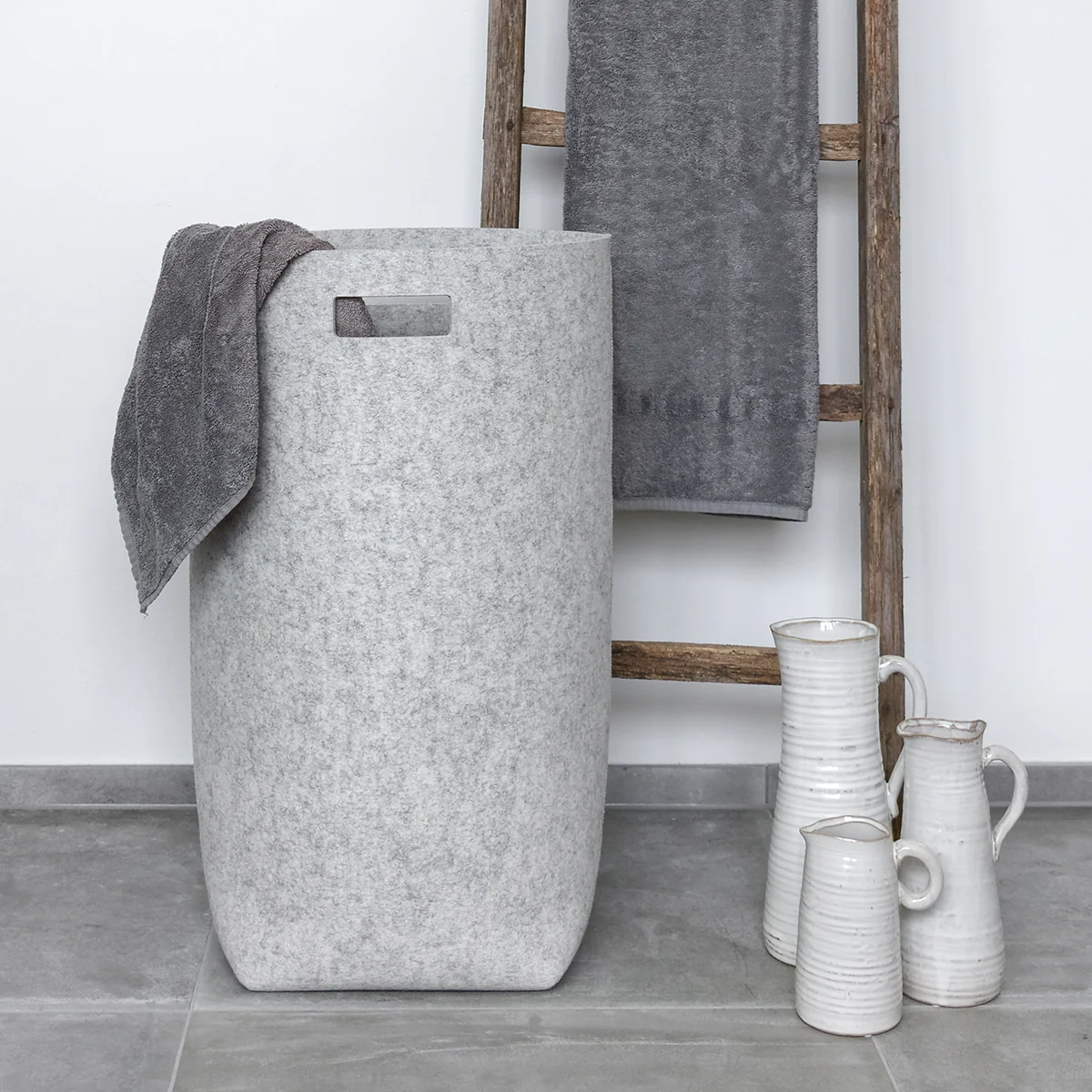 Hey Sign biedt de wasmand van vilt in vele verschillende kleuren en met de woorden "Wasserij", "30 graden" of "90 graden" op aanvraag.