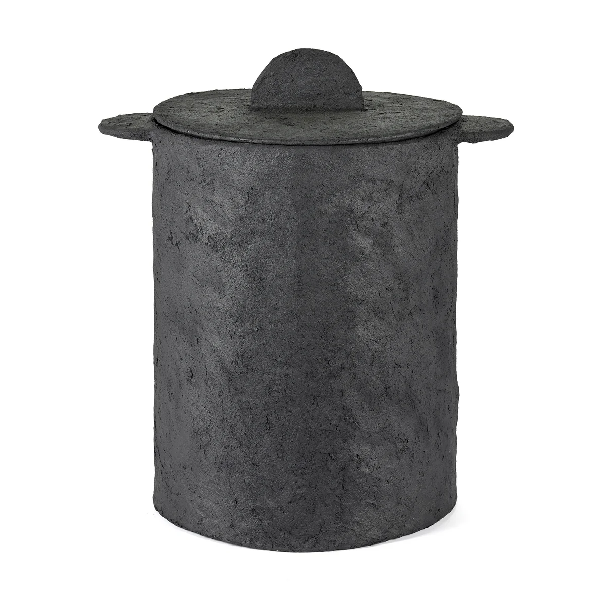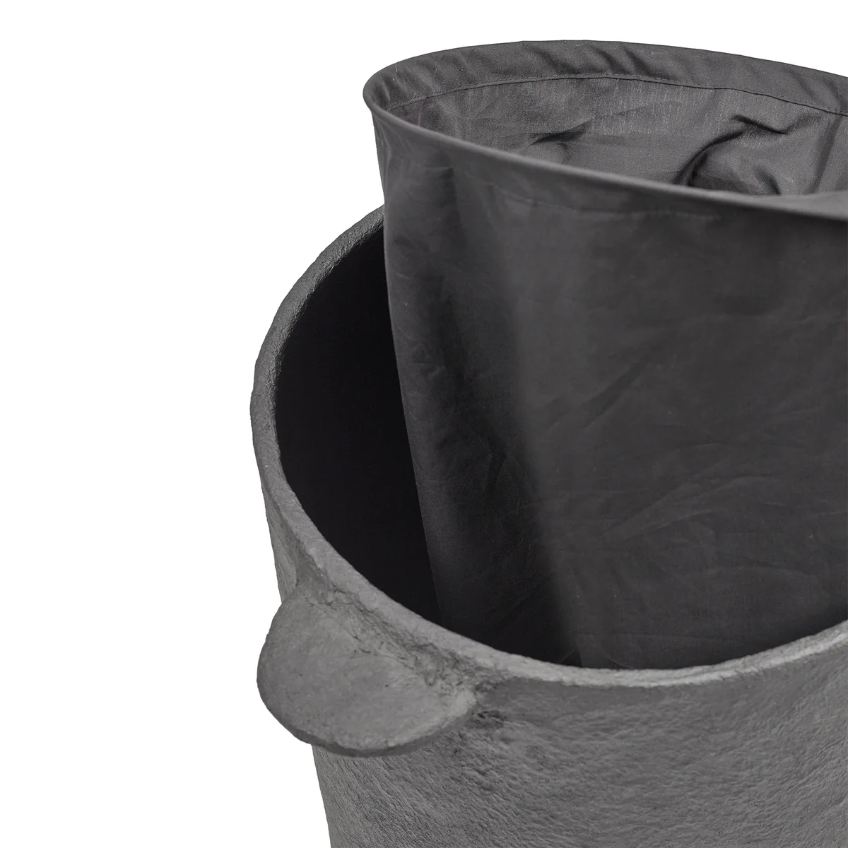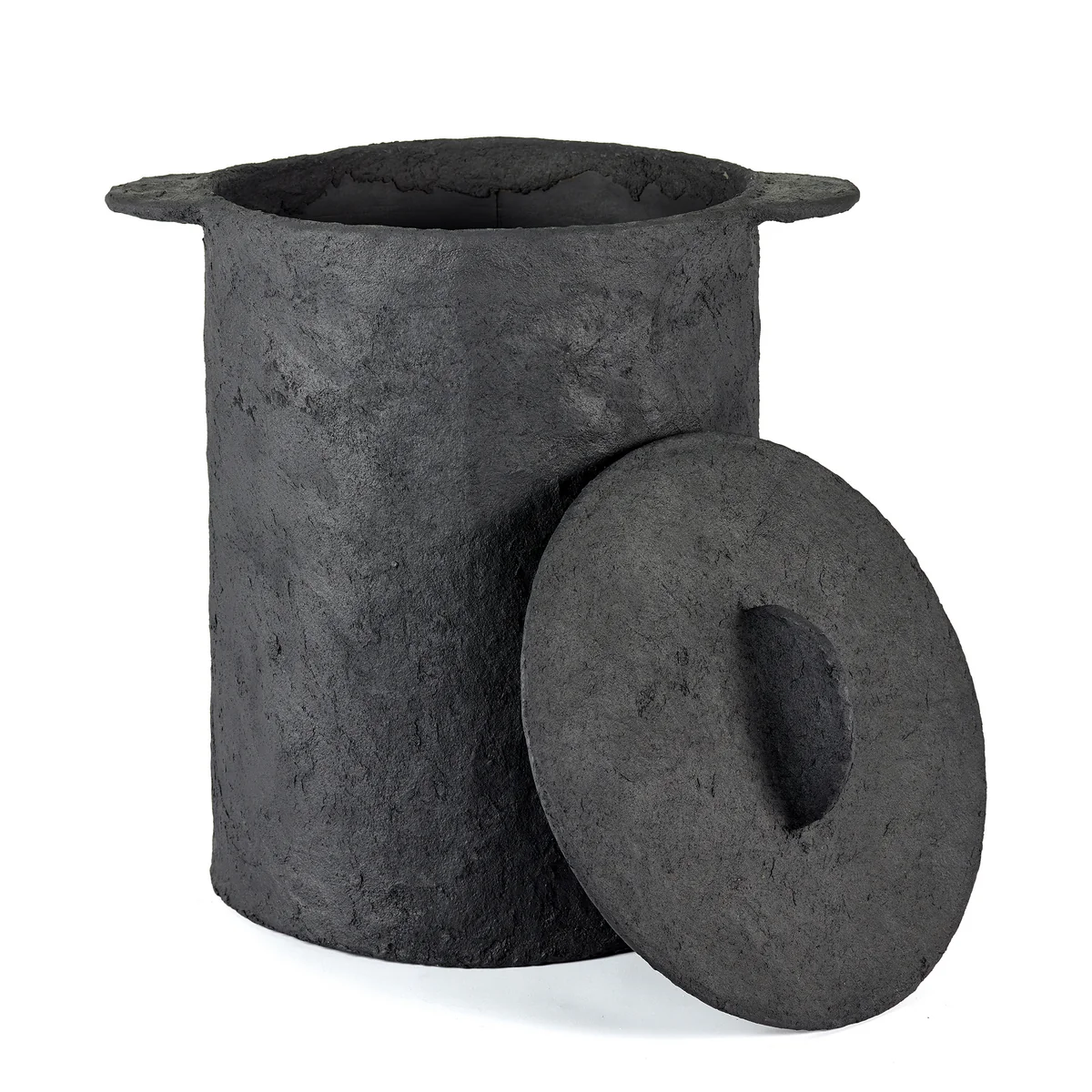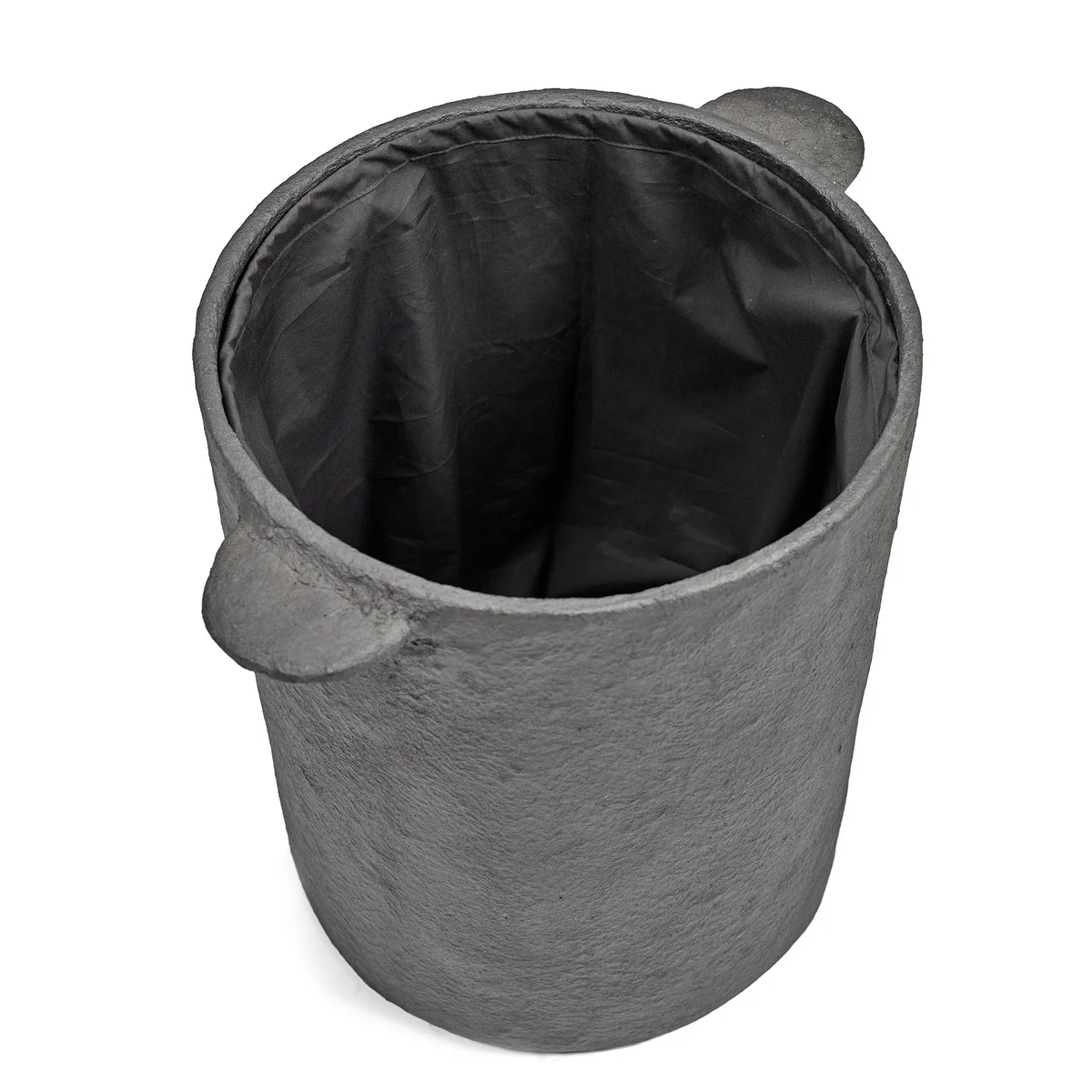 De mand is gemaakt van papier-maché met behulp van een uitgebreid laag-voor-laag proces en maakt indruk met zijn expressieve structuur en organische vorm. De diepzwarte kleur onderstreept het sculpturale uiterlijk en geeft het object een rustige, bijna monumentale uitstraling. Een uitneembare linnen zak binnenin zorgt voor praktisch gemak, terwijl het bijpassende deksel de inhoud discreet verbergt - ideaal voor stijlvol wonen met aandacht voor detail.