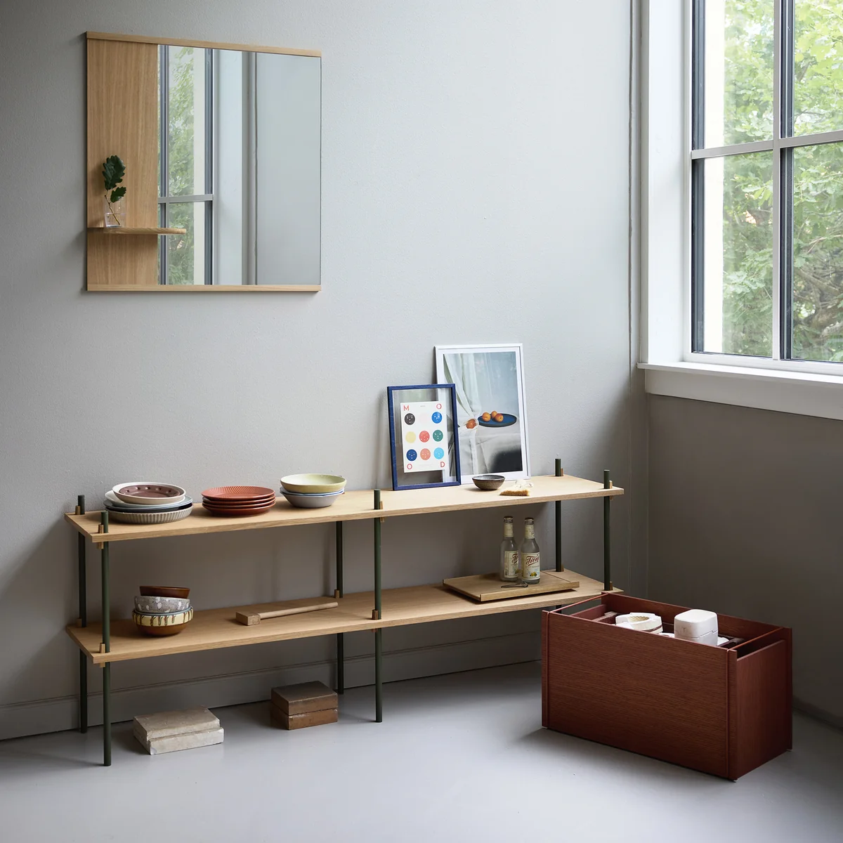 Wanneer de opbergdozen gestapeld zijn, lijken ze op een hoge plank en vormen ze een tijdloos meubelstuk in de gang of woonkamer. Ze kunnen ook worden gebruikt als een klein bijzettafeltje bij de bank of naast de fauteuil, zowel als plank en om dunne spreien, boeken of andere voorwerpen op te bergen.