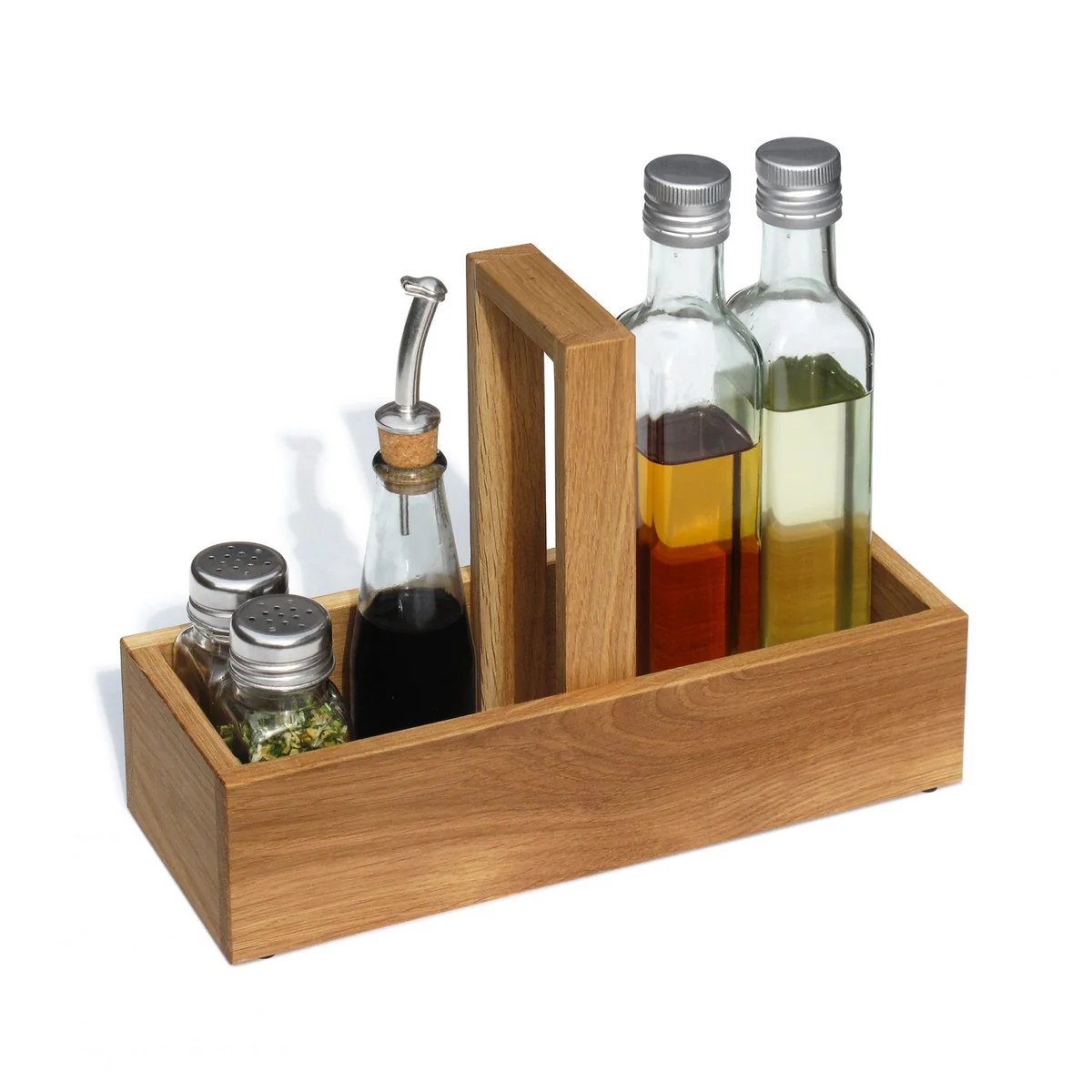 De tafeldoos azijn & olie van side by side is het perfecte hulpje voor je eettafel - functioneel, stijlvol en veelzijdig. Voor azijn, olie, zout en peper of als stijlvolle opbergplaats voor naaigerei, pennen en kleine voorwerpen: De minimalistische houten box raakt de kern van organisatie en design.