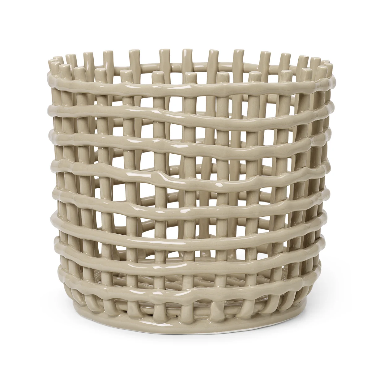 De keramieken mand van Ferm Living is een verfijnde herinterpretatie van traditioneel mandenvlechten en is een blikvanger in elke omgeving. De gevlochten manden zien er vertrouwd uit en hebben dankzij het keramiek een nieuwe look die op een verrassende en multifunctionele manier in elke ruimte past.