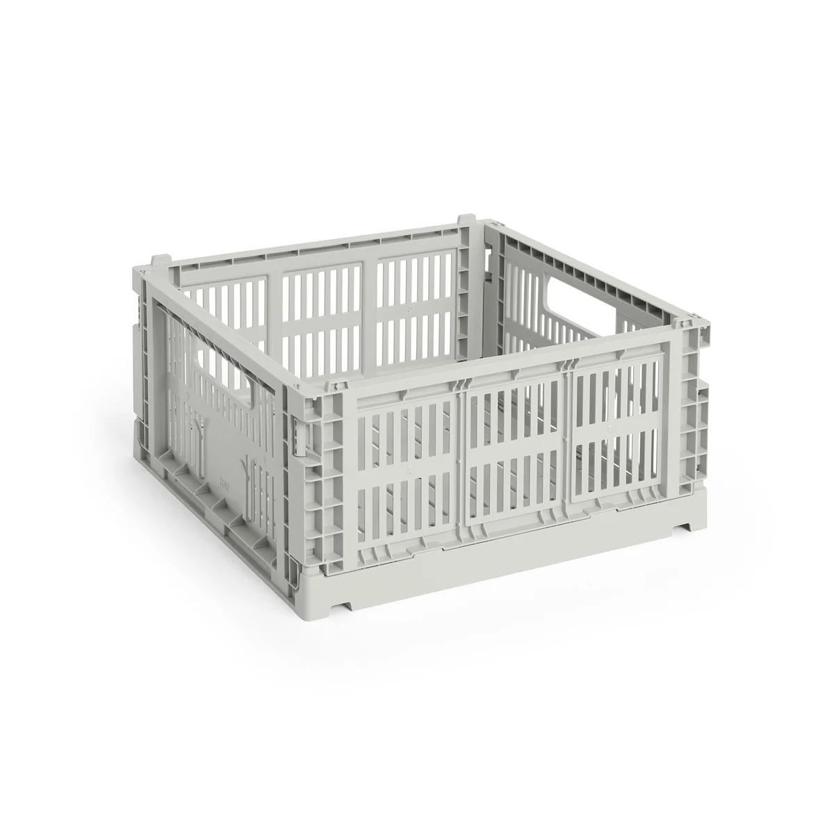 De serie HAY Colour Crate biedt functionele opbergoplossingen met een iconisch geperforeerd ontwerp. De kratten zijn gemaakt van 100% gerecycled plastic (post-consumer afval) en zijn verkrijgbaar in verschillende maten en kleuren - van kubusvormig tot rechthoekig. Dankzij hun slimme stapelbaarheid, optionele deksels en wielen en de optie om ze plat te vouwen als ze niet worden gebruikt, kunnen de kratten flexibel worden gebruikt - voor opslag, presentatie of zelfs als onderdeel van modulaire meubelideeën.