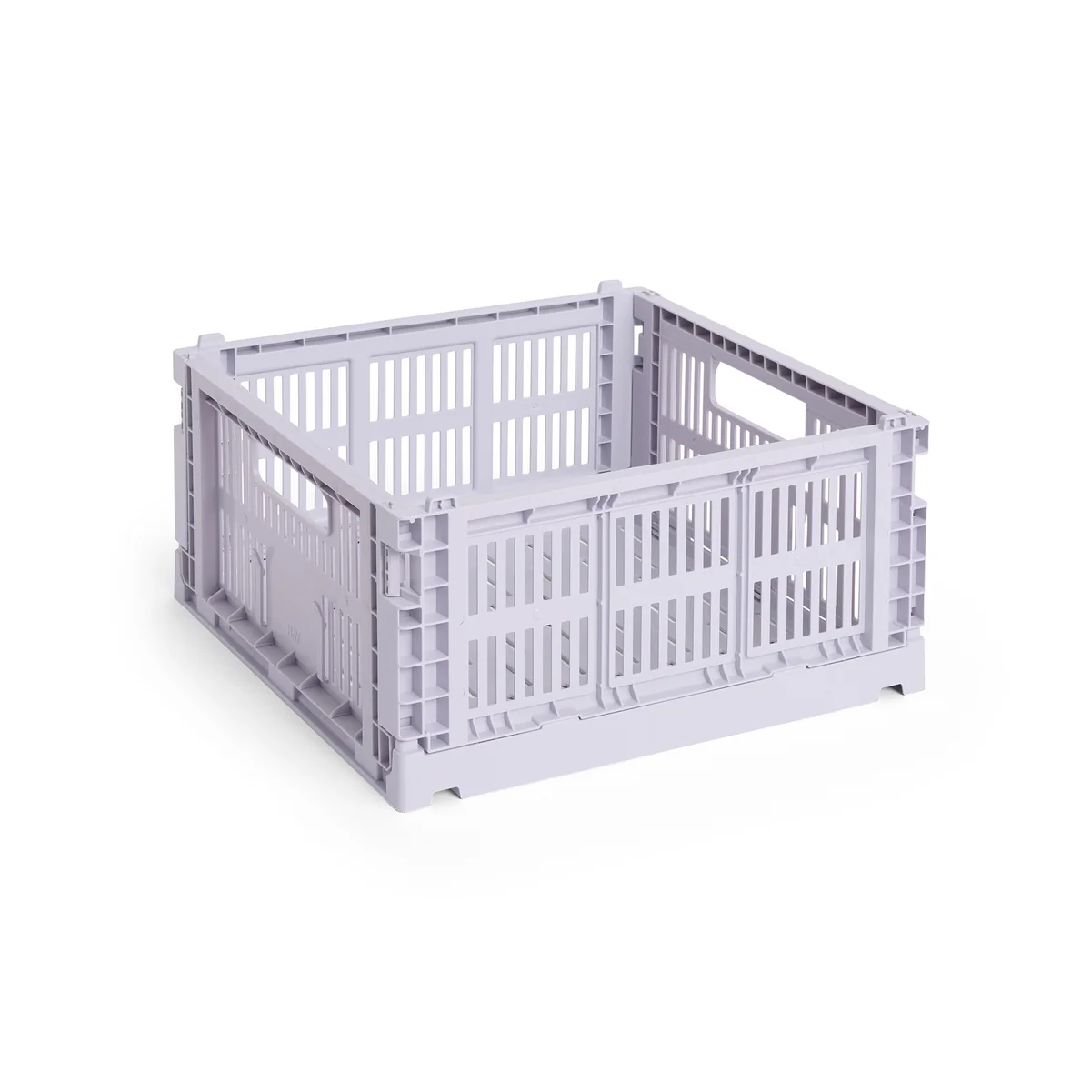 De serie HAY Colour Crate biedt functionele opbergoplossingen met een iconisch geperforeerd ontwerp. De kratten zijn gemaakt van 100% gerecycled plastic (post-consumer afval) en zijn verkrijgbaar in verschillende maten en kleuren - van kubusvormig tot rechthoekig. Dankzij hun slimme stapelbaarheid, optionele deksels en wielen en de optie om ze plat te vouwen als ze niet worden gebruikt, kunnen de kratten flexibel worden gebruikt - voor opslag, presentatie of zelfs als onderdeel van modulaire meubelideeën.