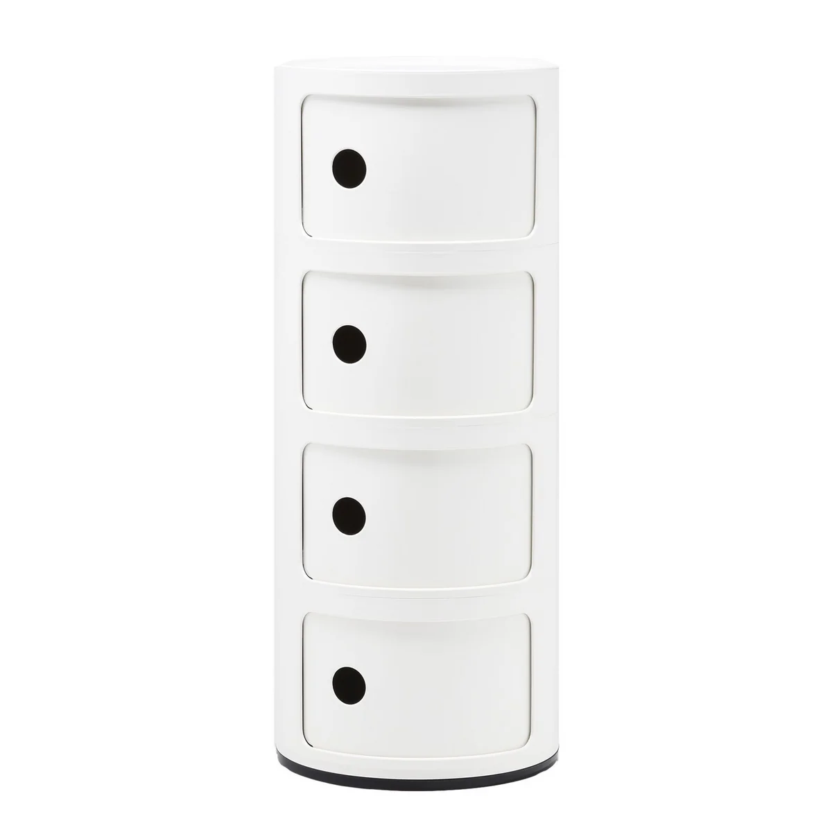 In 2017 introduceerde Kartell de nieuwe voorgeconfigureerde Componibili 4985 unit met vier compartimenten en een diameter van 32 cm - een nieuwe maat en nieuwe kleuren! Het basisontwerp uit 1969 van Anna Castelli Ferrieri overtuigt nog steeds met zijn knallende retro-look, nu met gedempte kleuren die het een tijdloze kwaliteit geven.