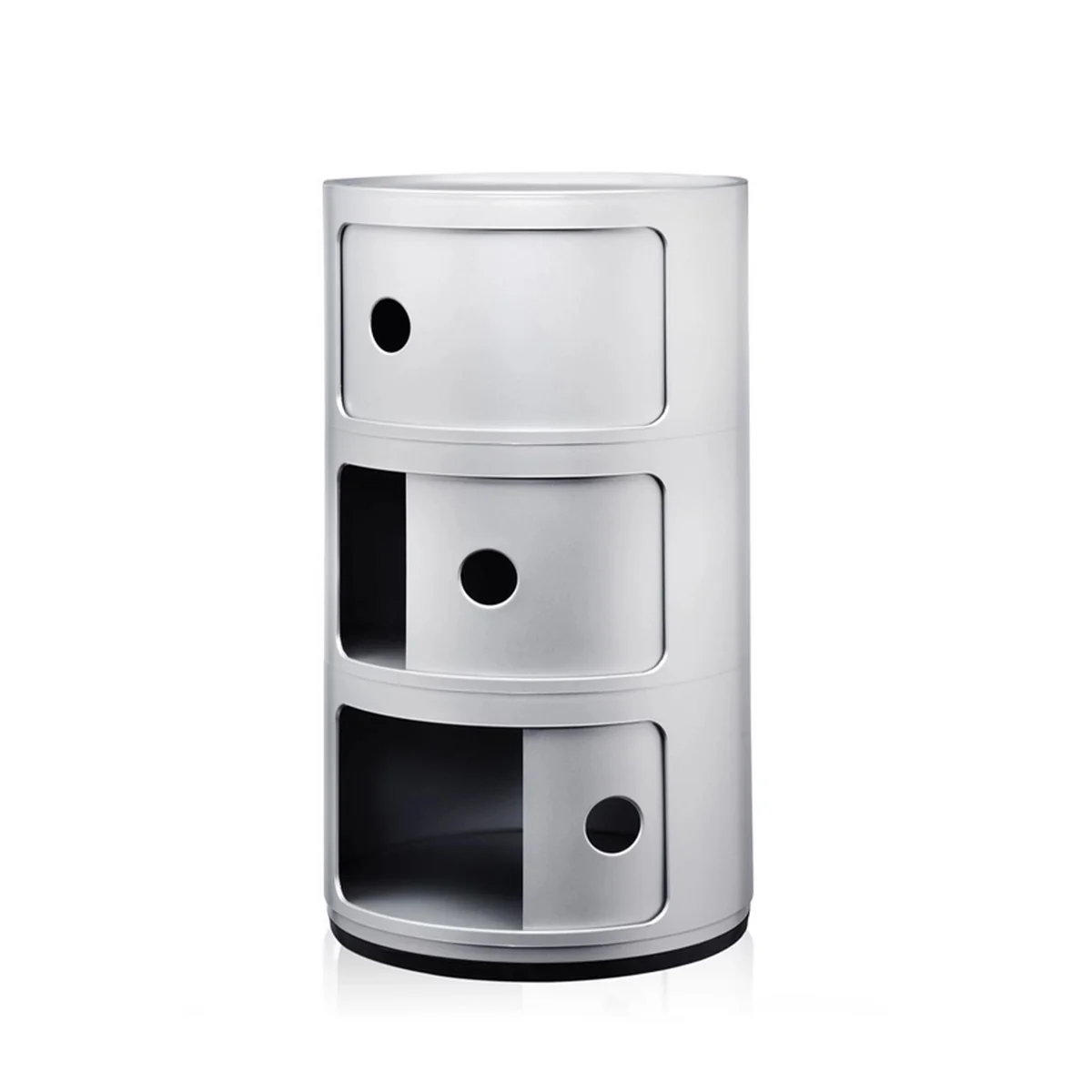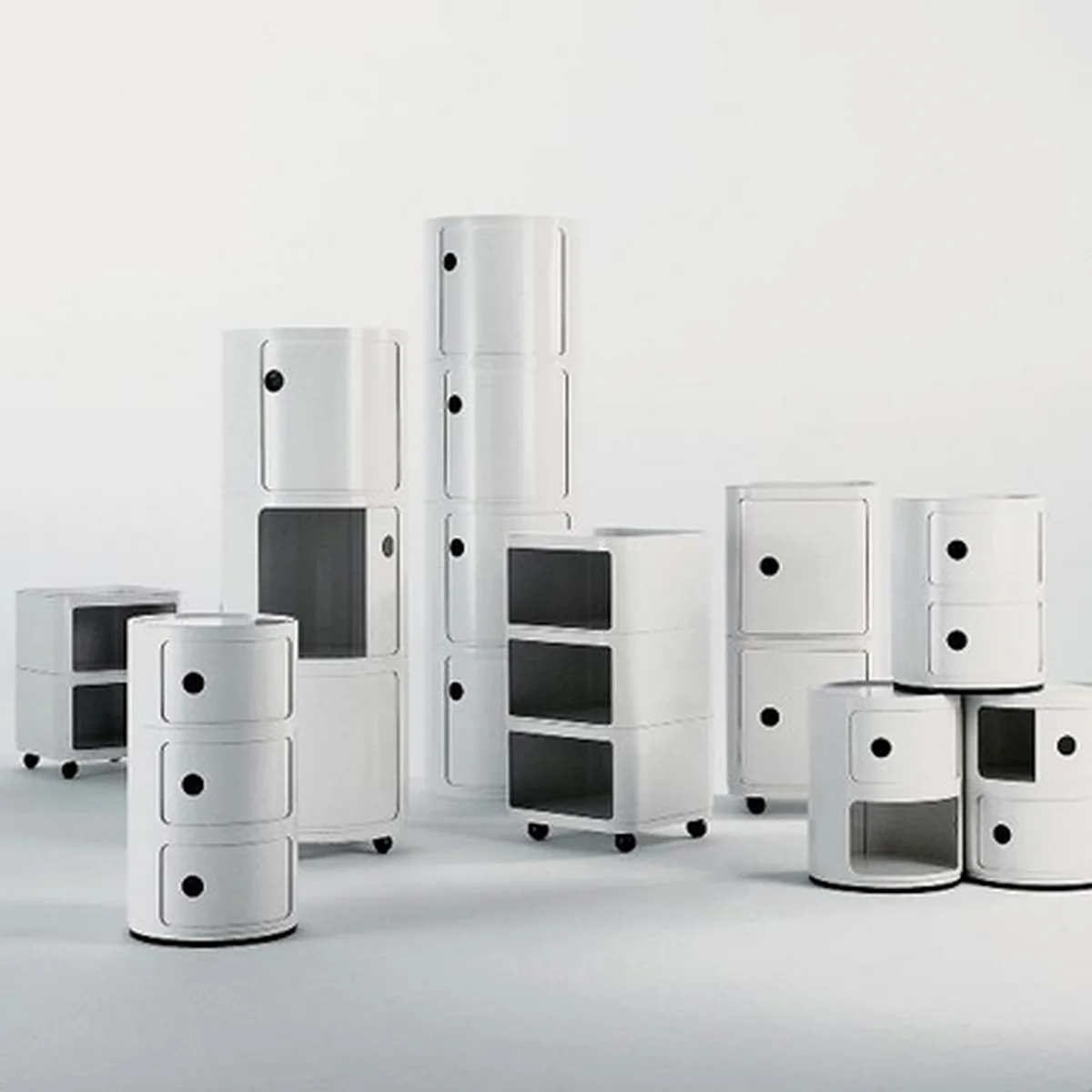 De Componibili zijn verkrijgbaar in ronde en vierkante versies en kunnen ook op wieltjes worden geleverd. Flexibel, functioneel, praktisch: de Componibili zijn een designklassieker met een traditie van dertig jaar die veel erkenning heeft gekregen voor de beknoptheid en innovatie van zijn ontwerp en die al lang in de permanente tentoonstelling van het Museum of Modern Art in New York en het Centre George Pompidou in Parijs is opgenomen.