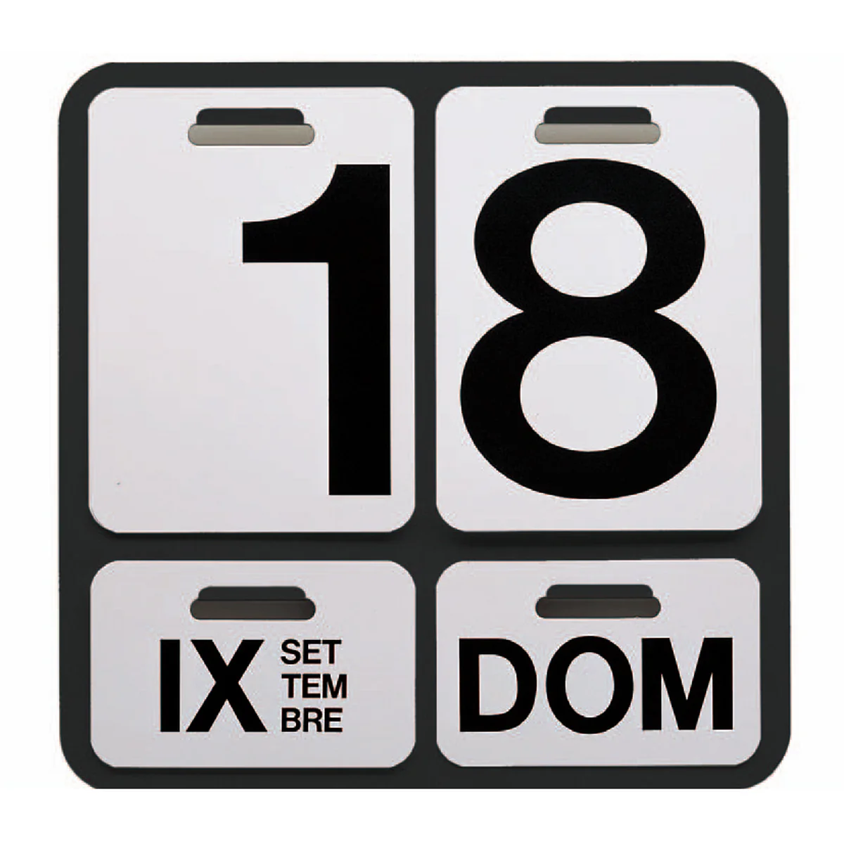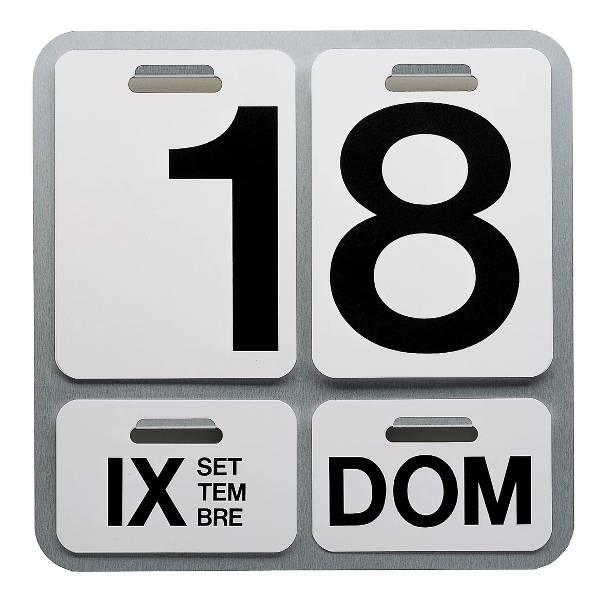 De basisplaat van de Danes Milano Formosa Wall Calendar wordt geleverd in zwart of in de kleur aluminium, met rode of zwarte letters.