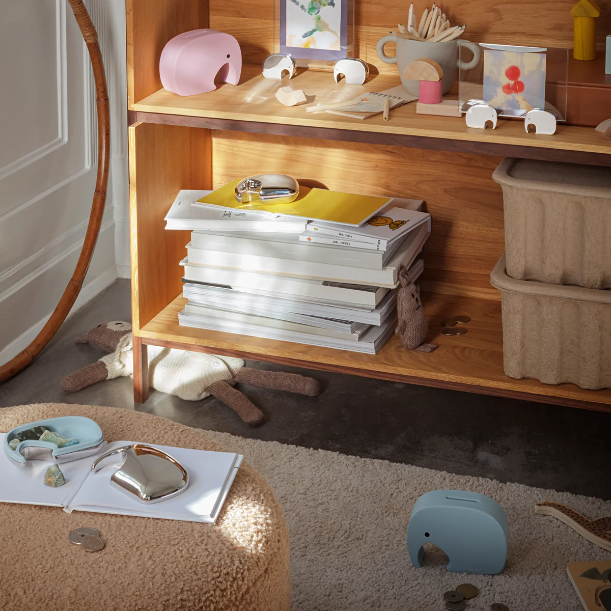 De Moneyphant is een prachtig geschenk en een goede manier om kinderen en jongeren aan te moedigen geld te sparen. Al in 1987 ontwierp Jørgen Møller samen met zijn kleinkind de flesopener-olifant. In de loop der jaren volgden andere olifantontwerpen voor Georg Jensen . In samenwerking met zijn achterkleinzoon heeft Jørgen Møller nu de Moneyphant . Als accessoire bij de spaarpot zijn er twee tweelingolifanten die precies passen in de opening tussen de voorpoten en de slurf. Het gekozen materiaal eikenhout vormt een prachtig contrast met de naar keuze witte, zilveren of zwarte Moneyphant .
