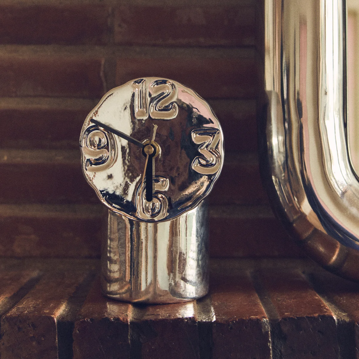 De retro keramische tafelklok van HKliving combineert functionaliteit met nostalgische charme. Dankzij de handgemaakte afwerking en de natuurlijke imperfecties die tijdens het bakproces ontstaan, is elke klok een uniek kunstwerk. Het glanzende chroomglazuur en de handgeschilderde nummerplaat geven de klok een subtiele metallic glans die het licht prachtig vangt. De elegante chromen afwerking voegt diepte en een gepolijste look toe die in elke kamer een blikvanger zal zijn. Met zijn compacte formaat en verfrissende kleurtint combineert deze tafelklok moeiteloos de charme van weleer met modern design, waardoor het een tijdloos hoogtepunt in je huis wordt.