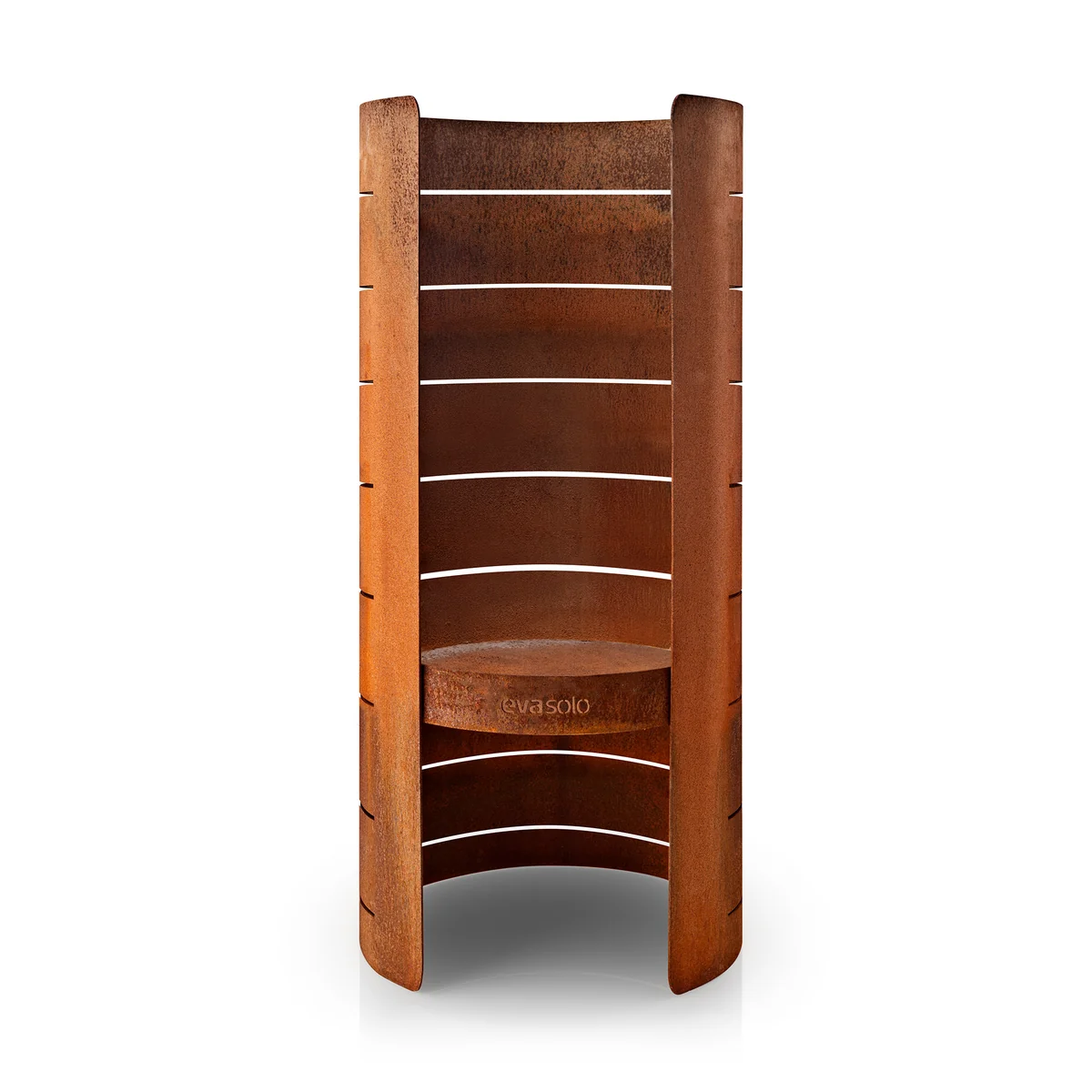 Deze hoge, decoratieve houtkachel van cortenstaal is geschikt voor de tuin of het terras, waar hij het nieuwe middelpunt van het gezin zal worden.