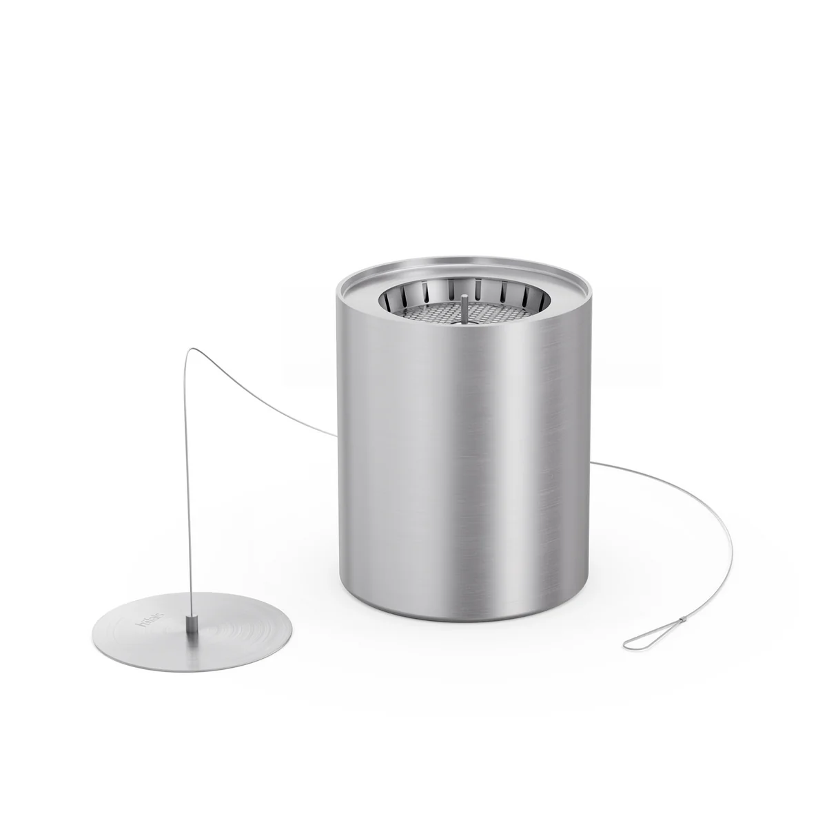 De Spin Bio-brander met Eco-Ring en blusdeksel van höfats. Dankzij de geavanceerde brandertechnologie produceert hij een levendige vlam die zelfs bij daglicht goed zichtbaar is. De gesloten bio-brander kan veilig worden gevuld met vloeibare bio-ethanol via het veiligheidsventiel en biedt een brandtijd van meer dan 1,5 uur. De vlamhoogte kan worden geregeld met de Eco-Ring om de brandtijd tot 50% te verlengen.