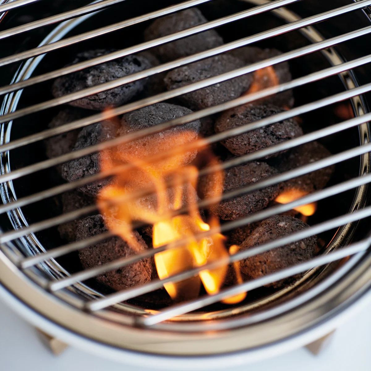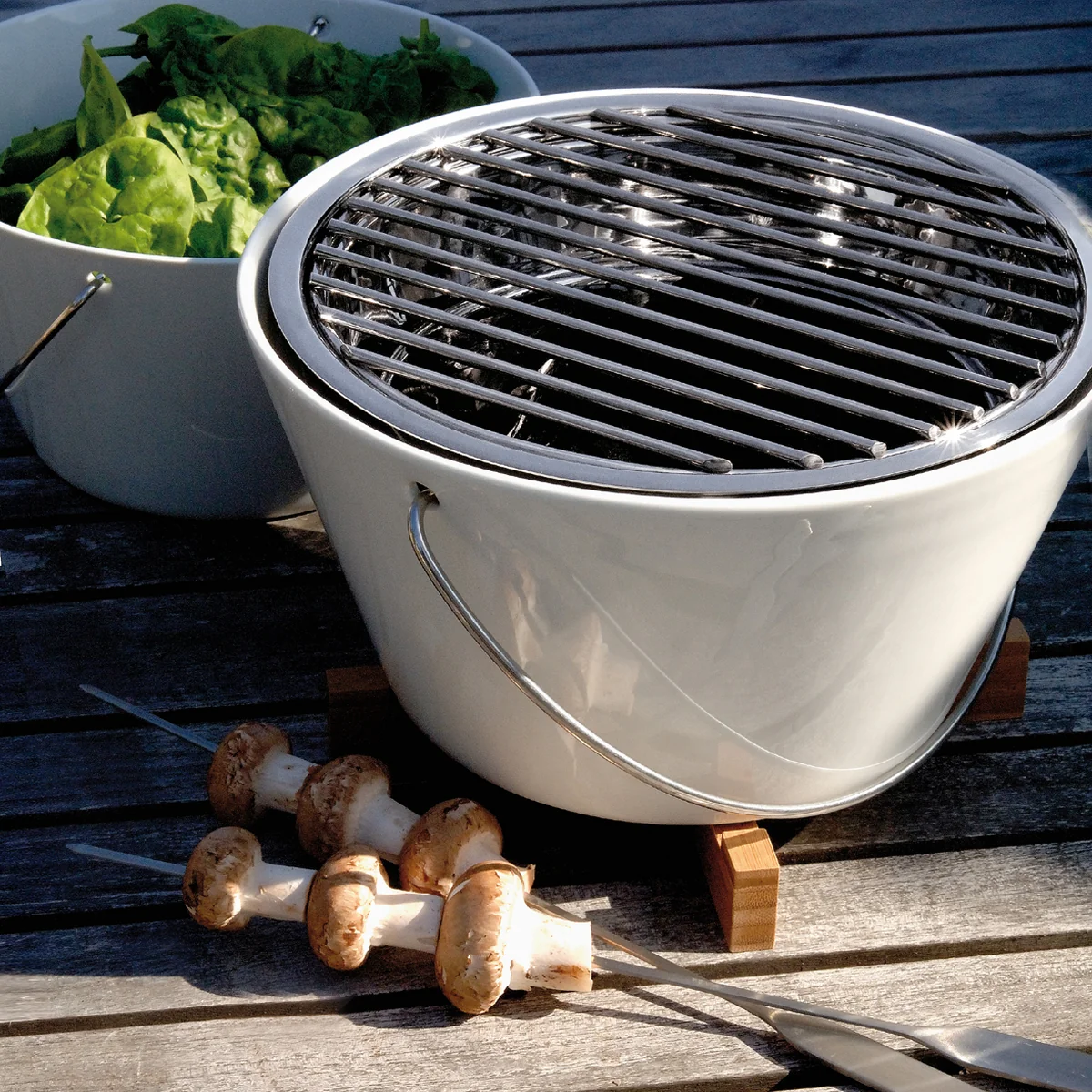 Zet de porseleinen grill met verwarmde houtskool in de aparte kolendoos op tafel en in een oogwenk kun je beginnen: schelpdieren, kippenvleugels, champignons en nog veel meer kunnen gemakkelijk en decoratief worden gebarbecued.