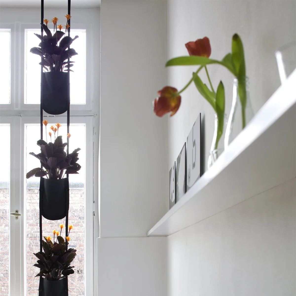 Tot vijf plantzakken kunnen onder elkaar worden gehangen om bijvoorbeeld een kamerscherm te maken. De wandbevestiging speciaal ontwikkeld voor Urban Garden