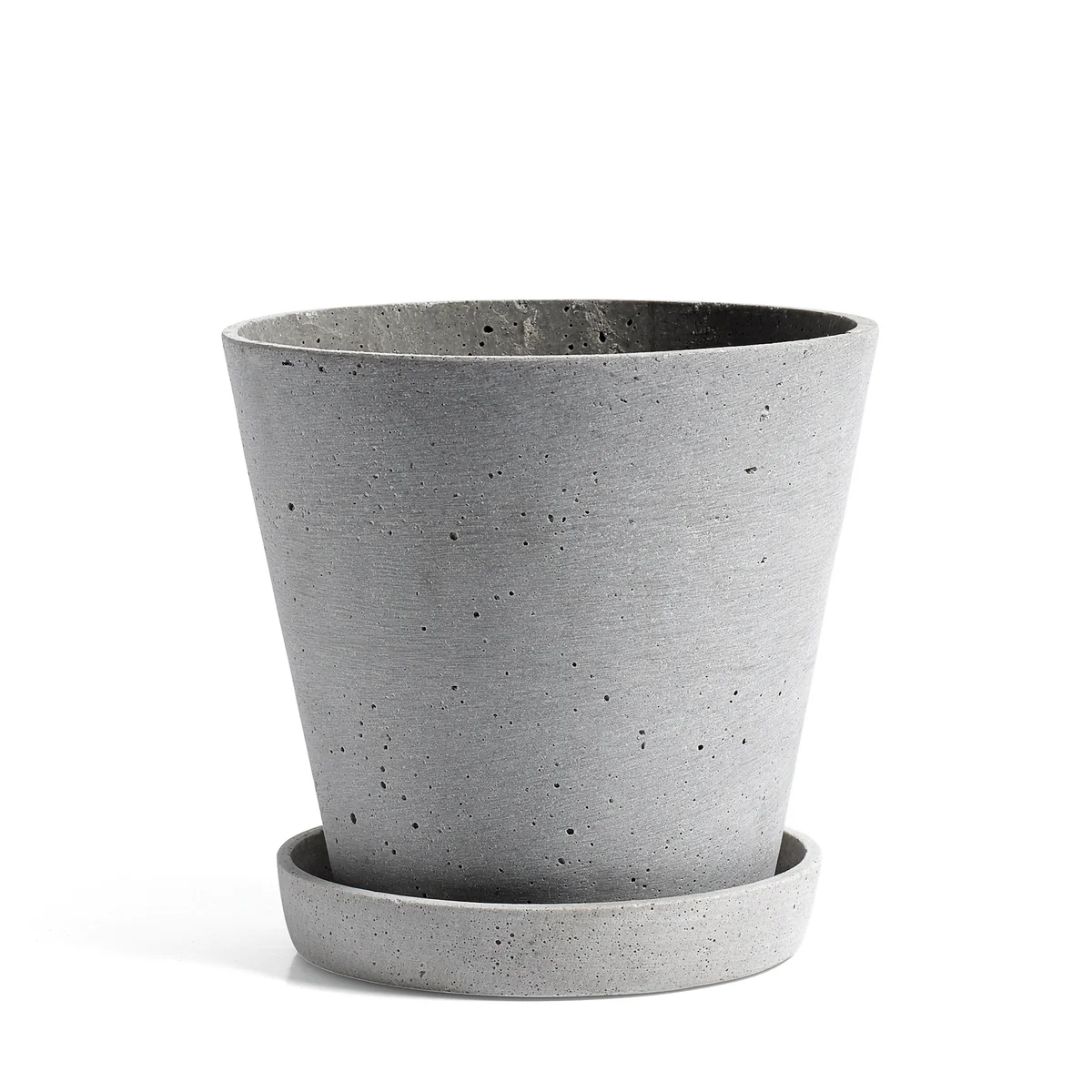 HAY vervaardigt de bloempot van polystone, een kunststof die waterafstotend is en bestand tegen verwering en krassen. Het speciale materiaal geeft de bloempot met schotel de indruk dat hij van gepolijst steen is gemaakt.