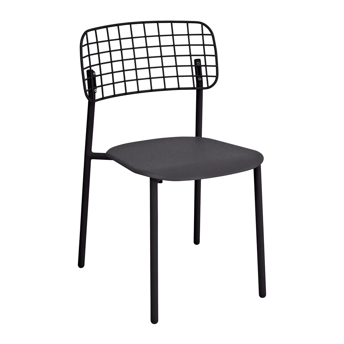 Het frame en de zitting van de stoel zijn van aluminium. De buitengewone rugleuning bestaat uit een gaas van roestvrij staal en is mechanisch bevestigd aan het frame. Tot slot wordt de stoel in kleur gelakt.