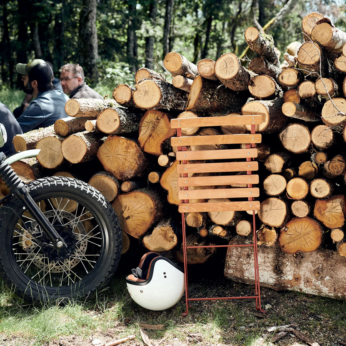 Bistro Zelfs vandaag de dag heeft de geest van de collectie nog niets van zijn charme verloren. De Naturel vouwstoel heeft een klassieke vorm, maar met houten latten. Terwijl de structuur nog steeds van metaal is, is de zitting gemaakt van natuurlijk beukenhout, dat weerbestendig, UV-bestendig en extreem duurzaam is dankzij een speciale behandeling.
