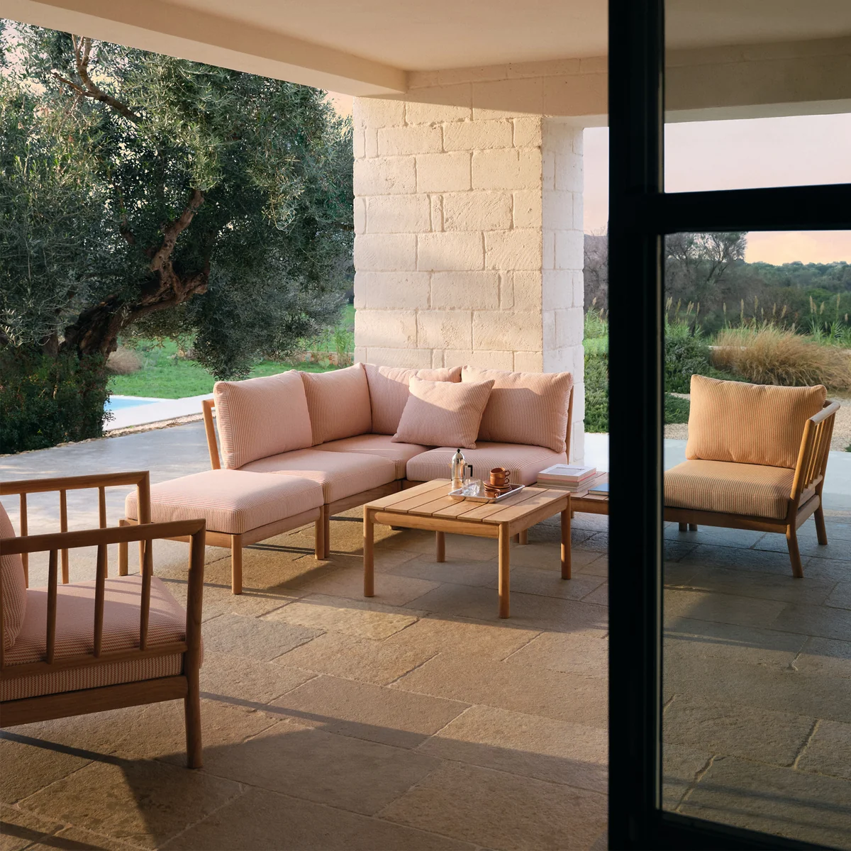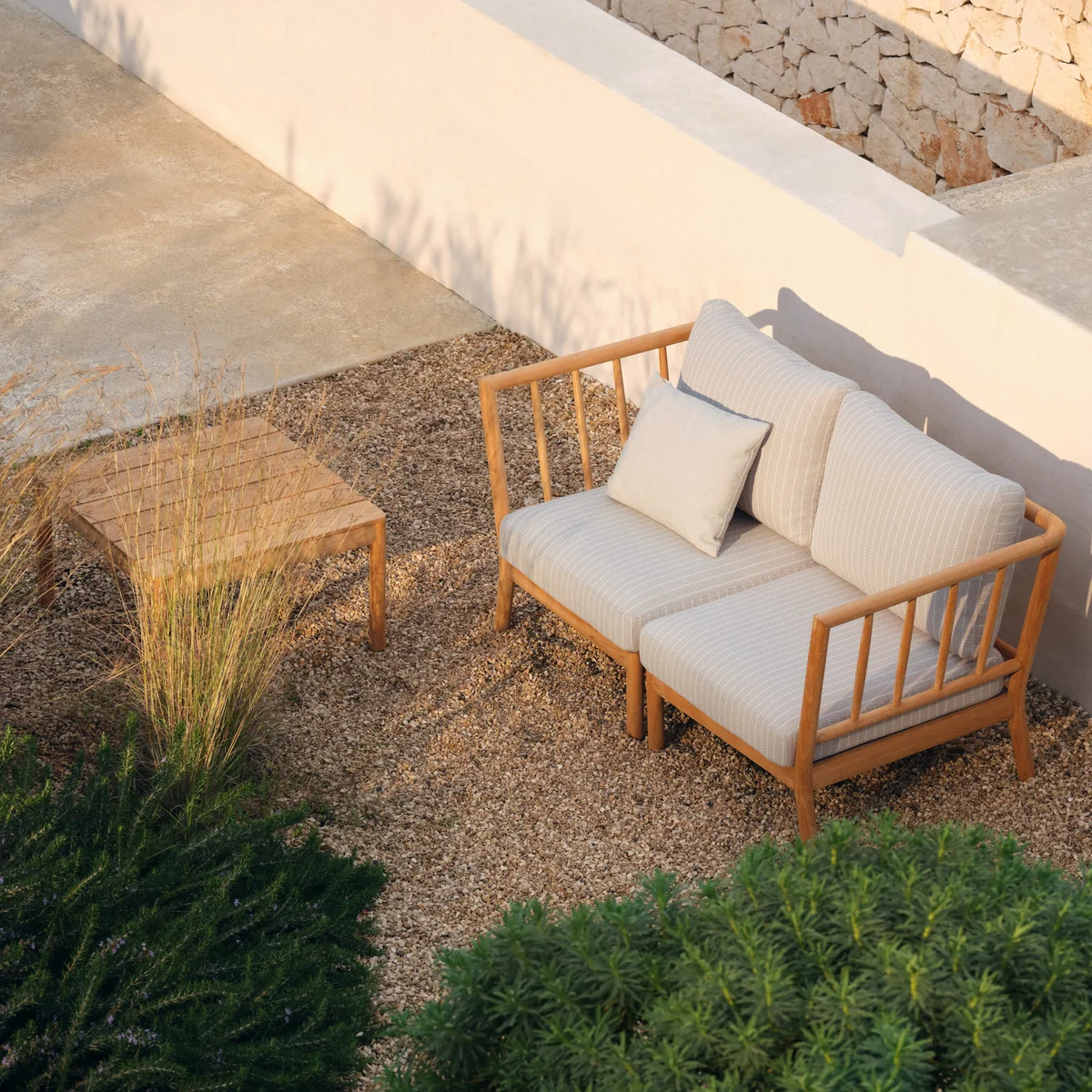 De modulaire Skagerak Tradition buitenbank, ontworpen door Povl B. Eskildsen voor Fritz Hansen, brengt de eenvoud en functionaliteit van Deens design naar buiten.