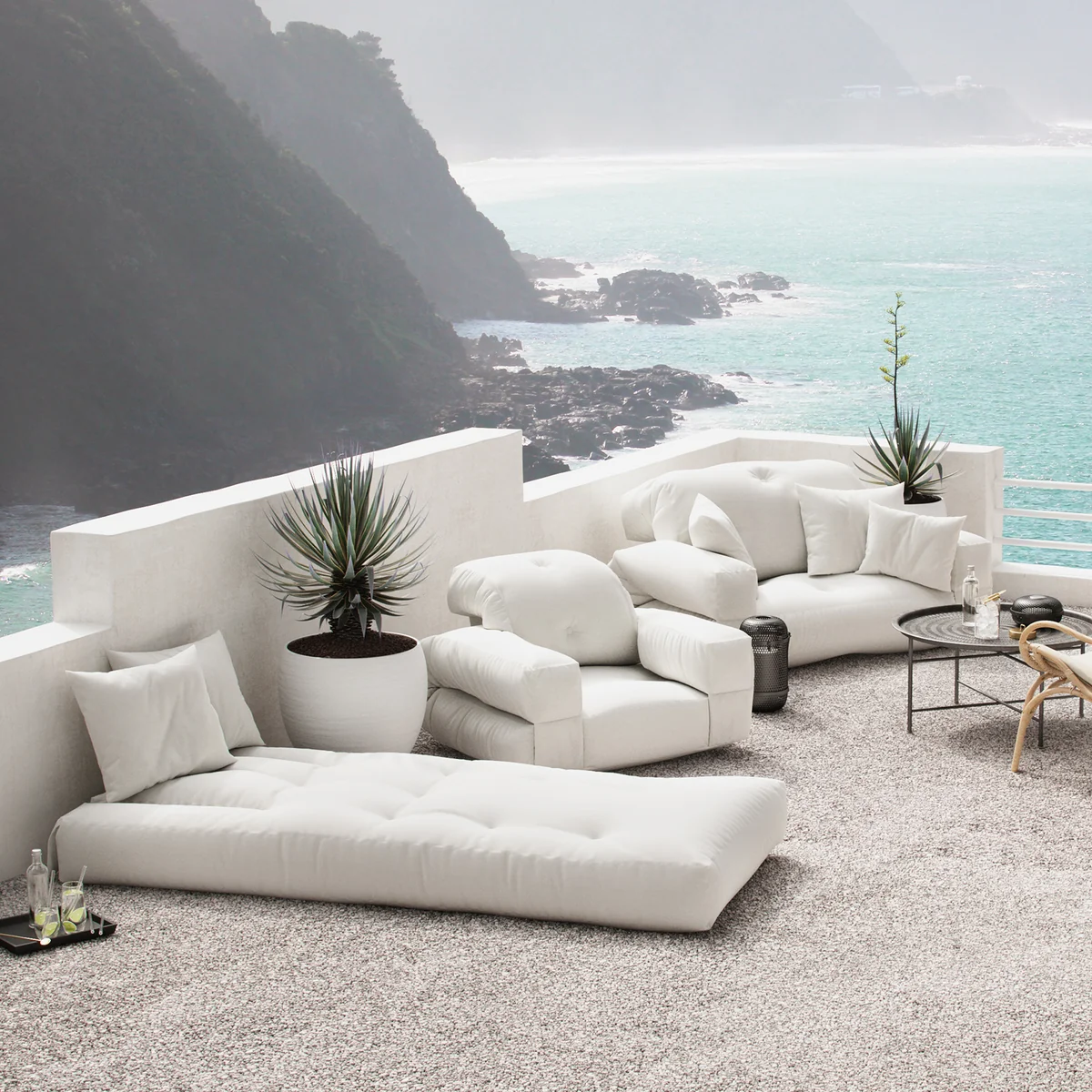 De Hippo OUT Sofa van Karup Design s brengt geheim comfort en multifunctionaliteit naar buiten. Dankzij de speciale, vlek- en waterbestendige Dralon-vezel kan het designstuk met een zuiver geweten op het terras, in de patio of naast het zwembad worden gebruikt.