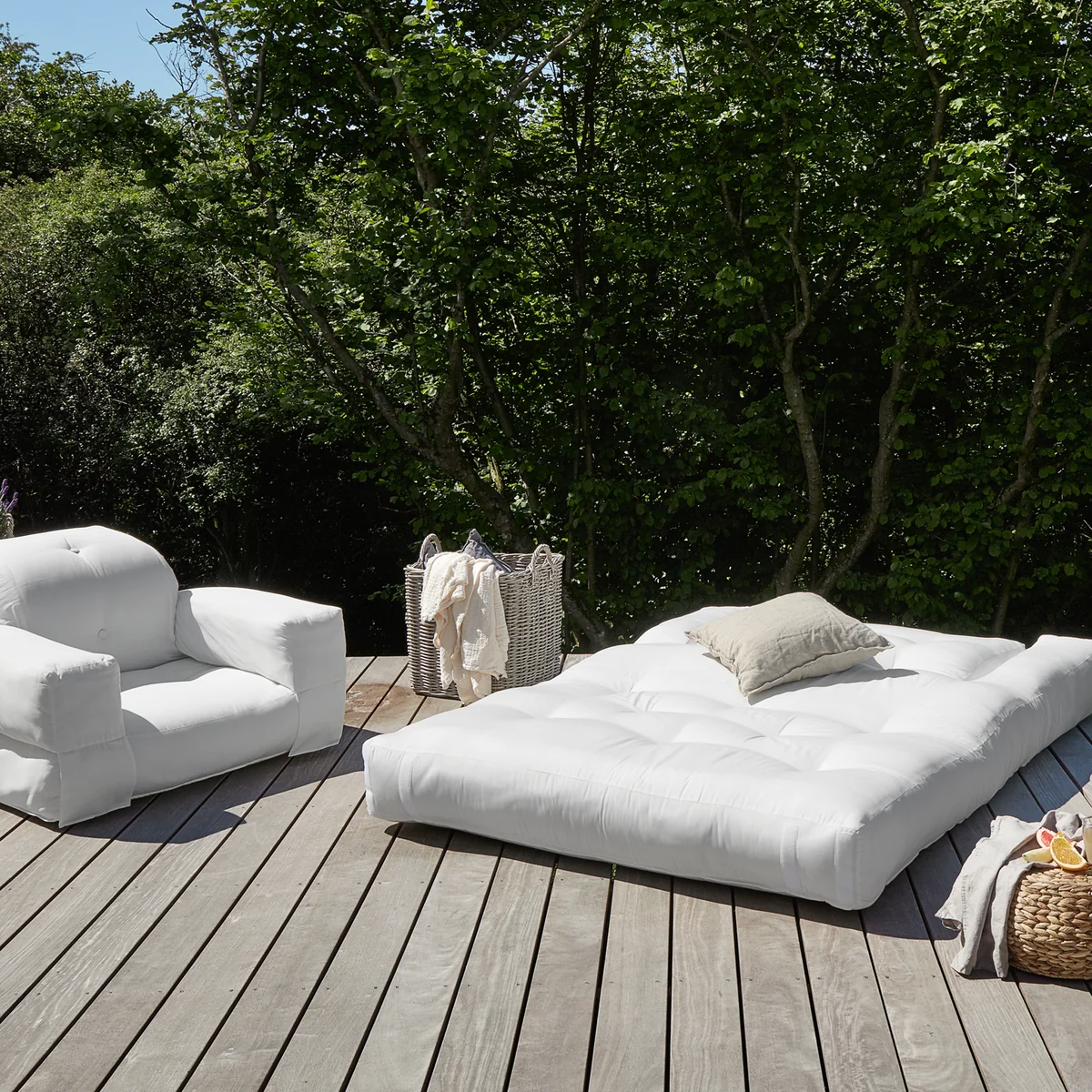 De Hippo OUT sofa van Karup Designs brengt stealth comfort en multifunctionaliteit naar buiten. Dankzij de speciale, vlek- en waterbestendige Dralon vezel kan het designstuk met een gerust geweten op het terras, de patio of naast het zwembad worden gebruikt.
