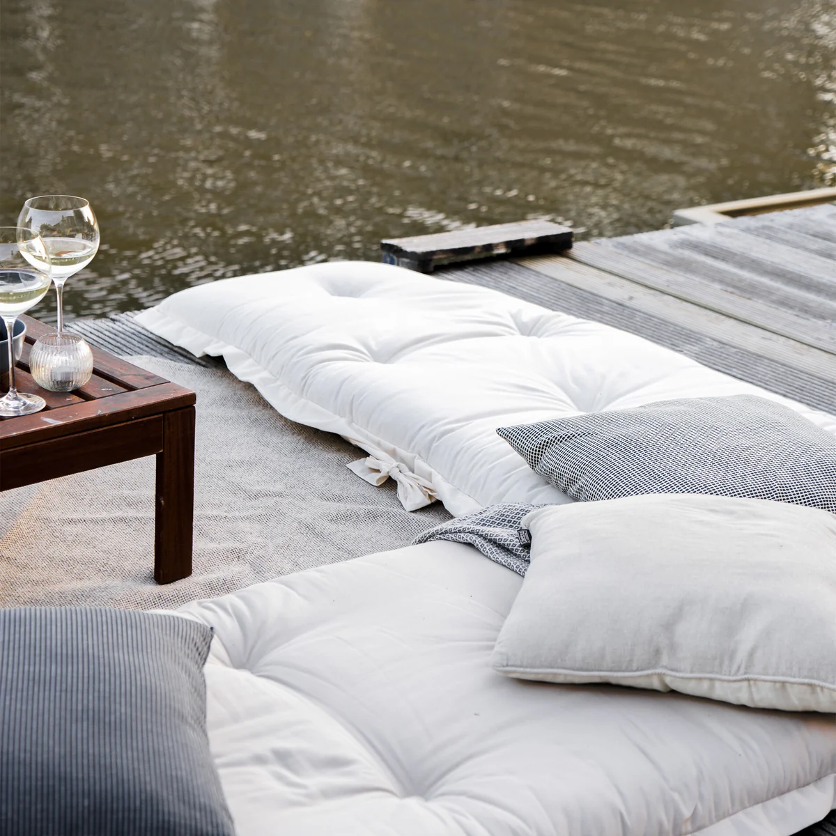 Sit and Sleep OUT van Karup Design is een veelzijdig gestoffeerd meubelstuk dat op verschillende manieren binnen en buiten kan worden gebruikt. De zacht gevoerde matras is bekleed met een resistente polyacryl stof van Dralon, die licht, vuil- en waterafstotend is. Het kan dus zonder problemen in de tuin of op het terras worden gebruikt, maar moet wel met regen in de droge worden gebracht.