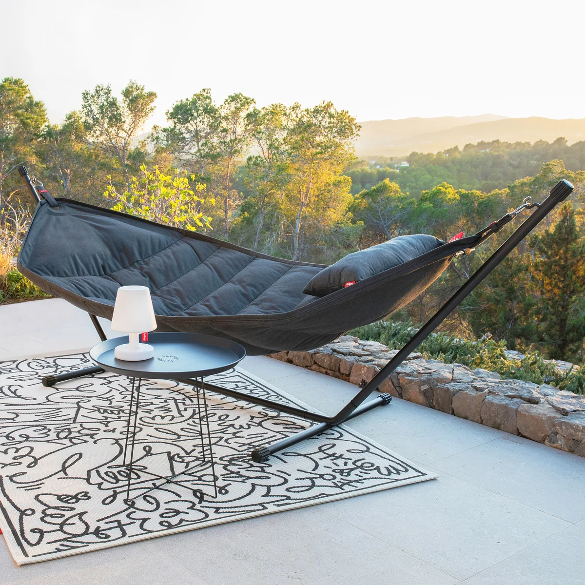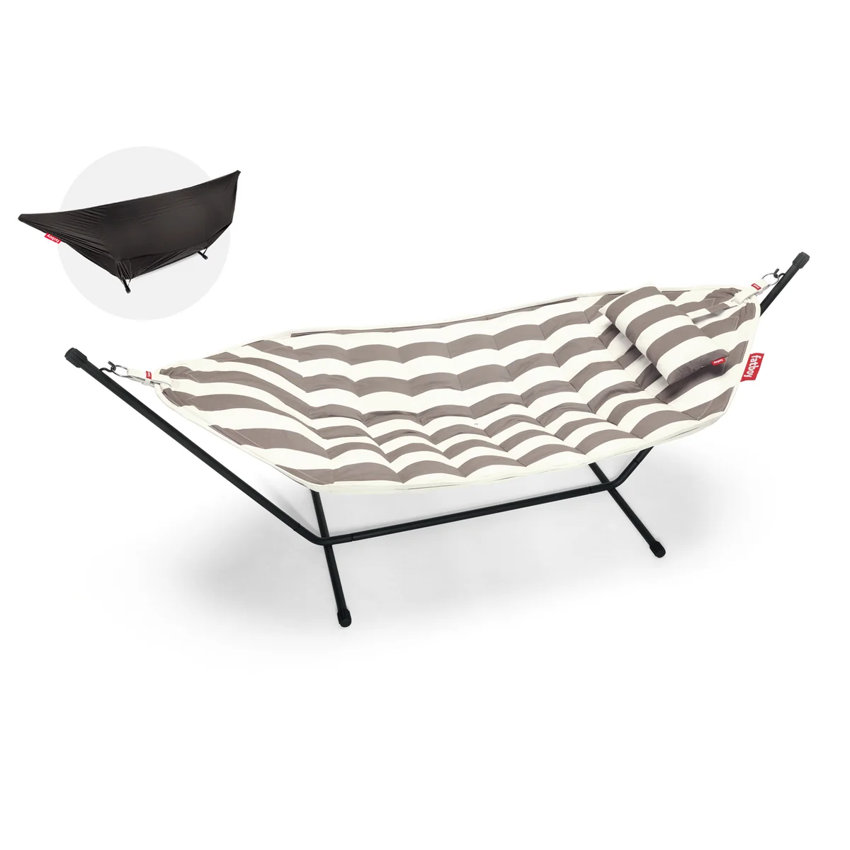 De Headdemock hangmat Superb Deluxe van Fatboy heeft naast de mat zelf een comfortabel kussen, een stevig frame en een beschermhoes. Hij is geschikt voor twee personen (max. 150kg) en is niet afhankelijk van een touw of boom.