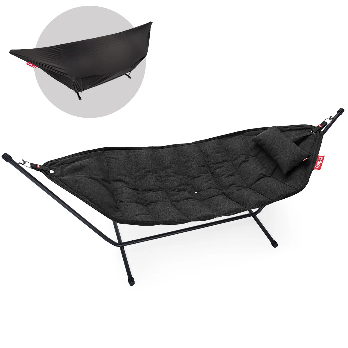 De Headdemock hangmat Superb Deluxe van Fatboy heeft naast de mat zelf een comfortabel kussen, een stevig frame en een beschermhoes. Hij is geschikt voor twee personen (max. 150kg) en is niet afhankelijk van een touw of boom.