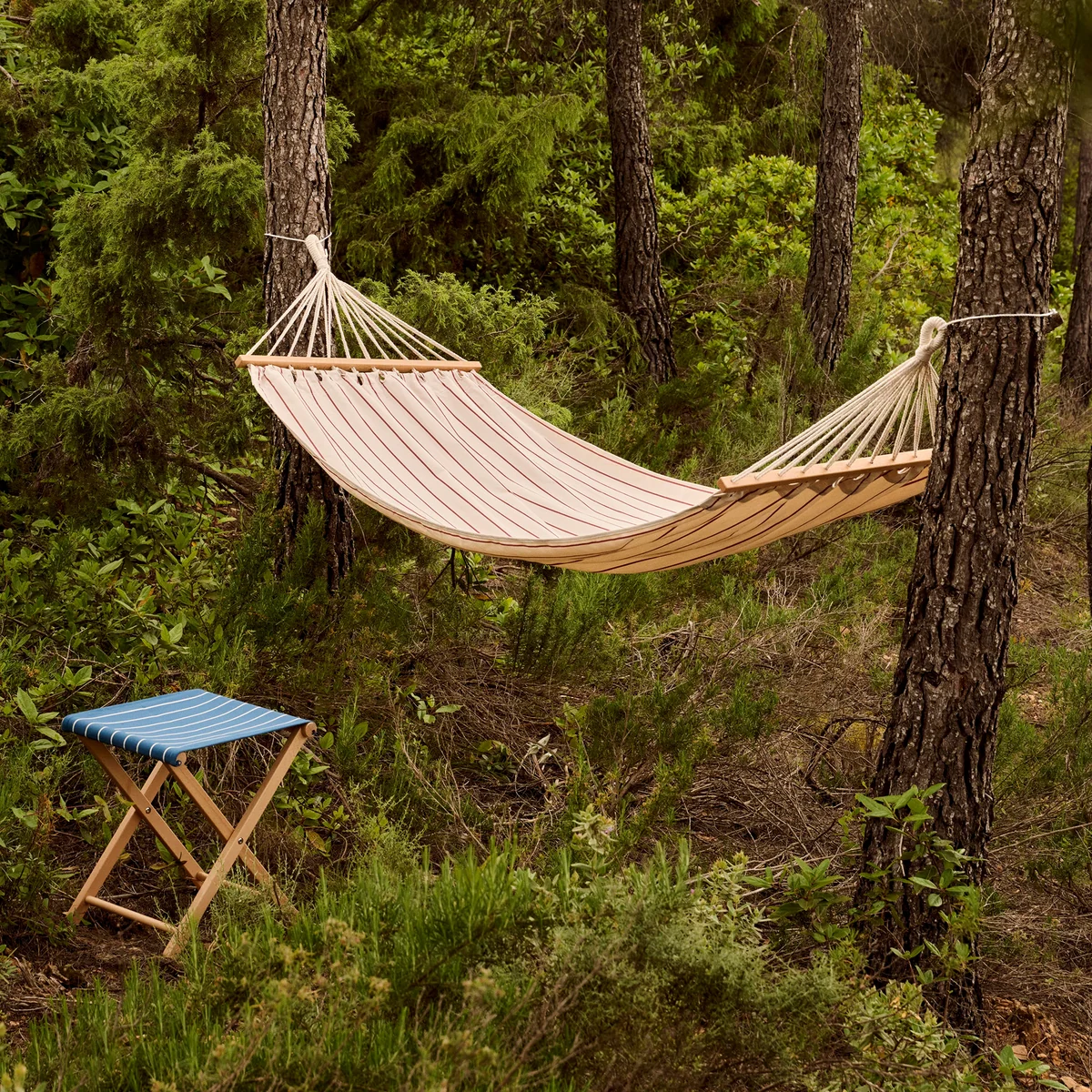 De Outdoor Market hangmat brengt comfort en stijlvolle lichtheid naar buiten. Gemaakt van gerecycled polyester en met beukenhouten eindstukken, combineert de hangmat robuuste materialen met natuurlijke esthetiek. Dankzij de touwbevestiging kan hij gemakkelijk tussen bomen of geschikte steunen worden bevestigd - ideaal om buiten te ontspannen of een dutje te doen. De hangmat wordt geleverd in een bijpassende stoffen tas met handgrepen voor eenvoudig transport en praktische opslag.