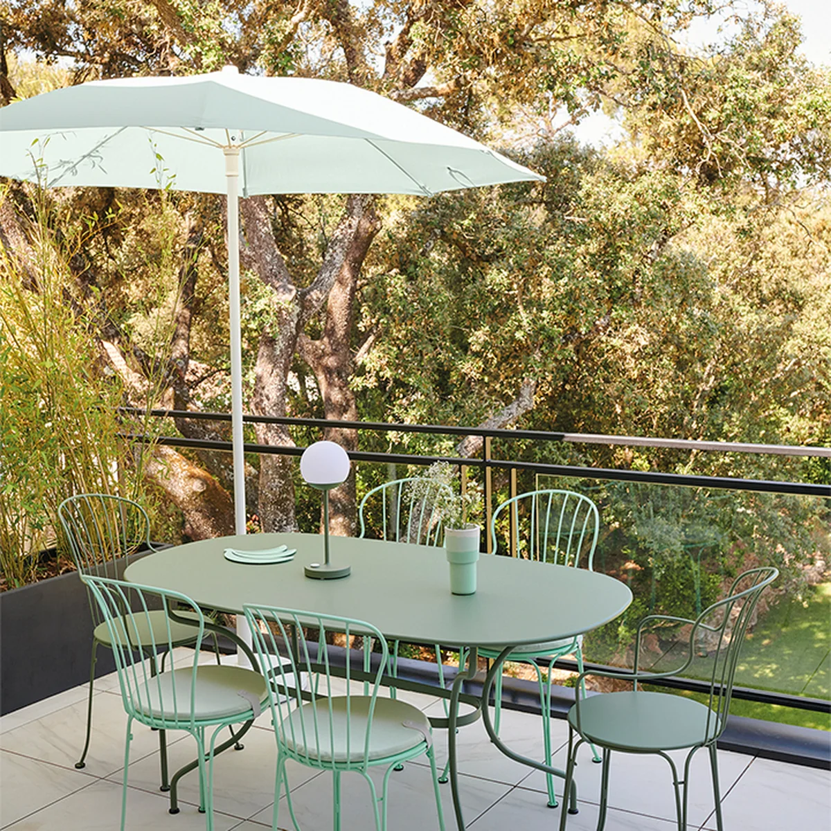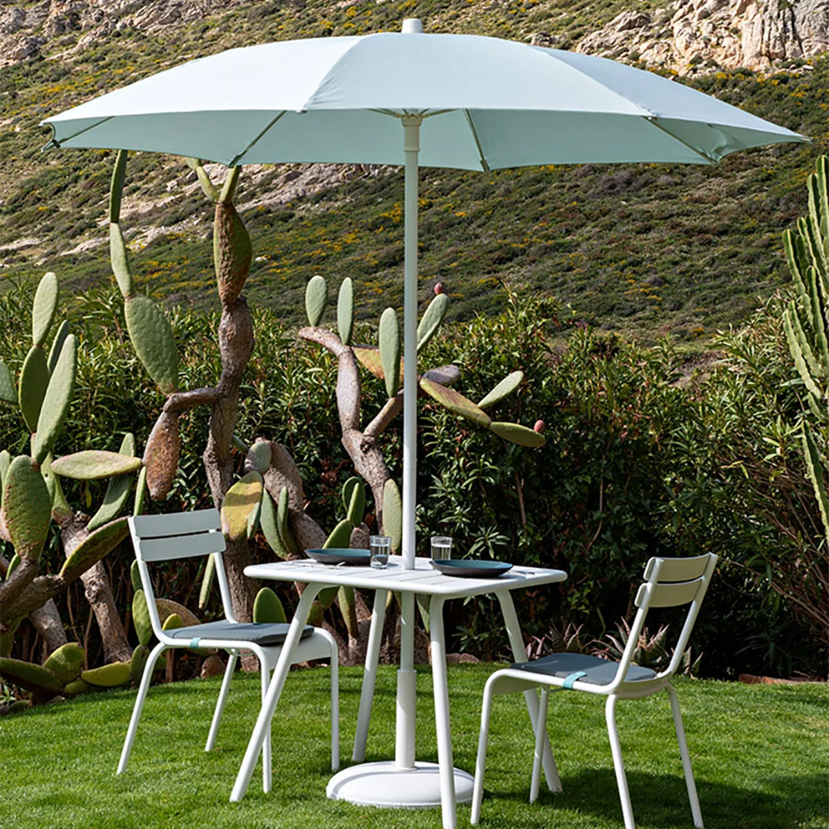 De Shadoo parasol van Fermob biedt u optimale bescherming tegen de zon. De 2,5 meter brede parasol is gemaakt van sterk, scheurvast Sunbrella doek. Sunbrella doek heeft als voordeel dat het waterafstotend is en bestand tegen UV-stralen, vlekken en schimmel. Het aluminium handvat en de glasvezelribben maken de hele structuur robuust, maar tegelijkertijd kan hij gemakkelijk worden verplaatst. De handgreep kan in tweeën worden gedeeld, zodat hij weinig ruimte inneemt en gemakkelijk kan worden opgeborgen.