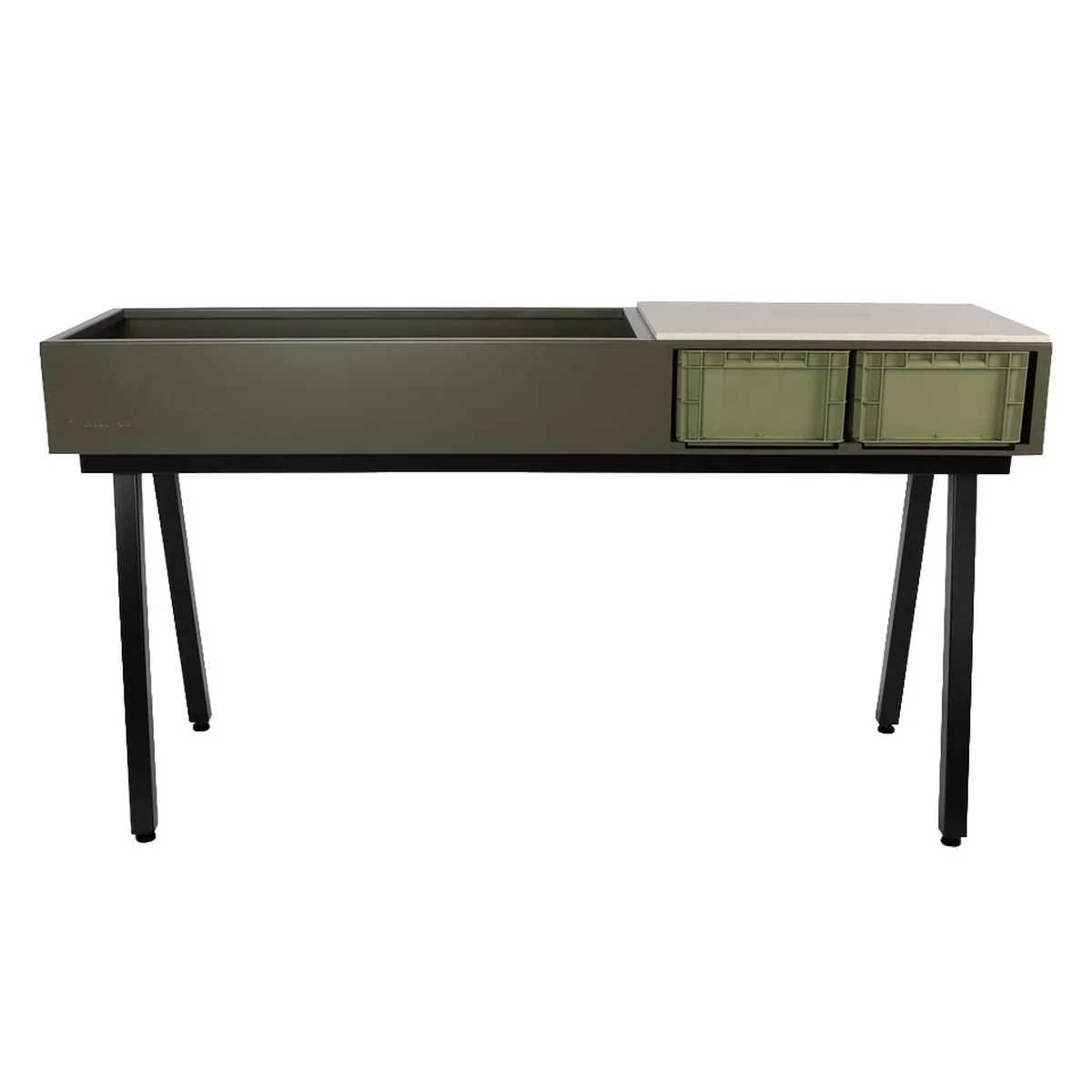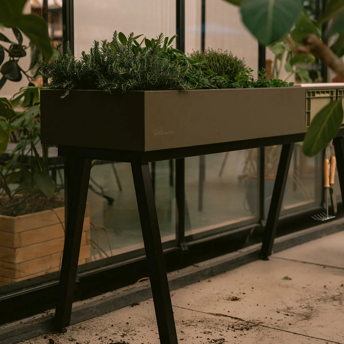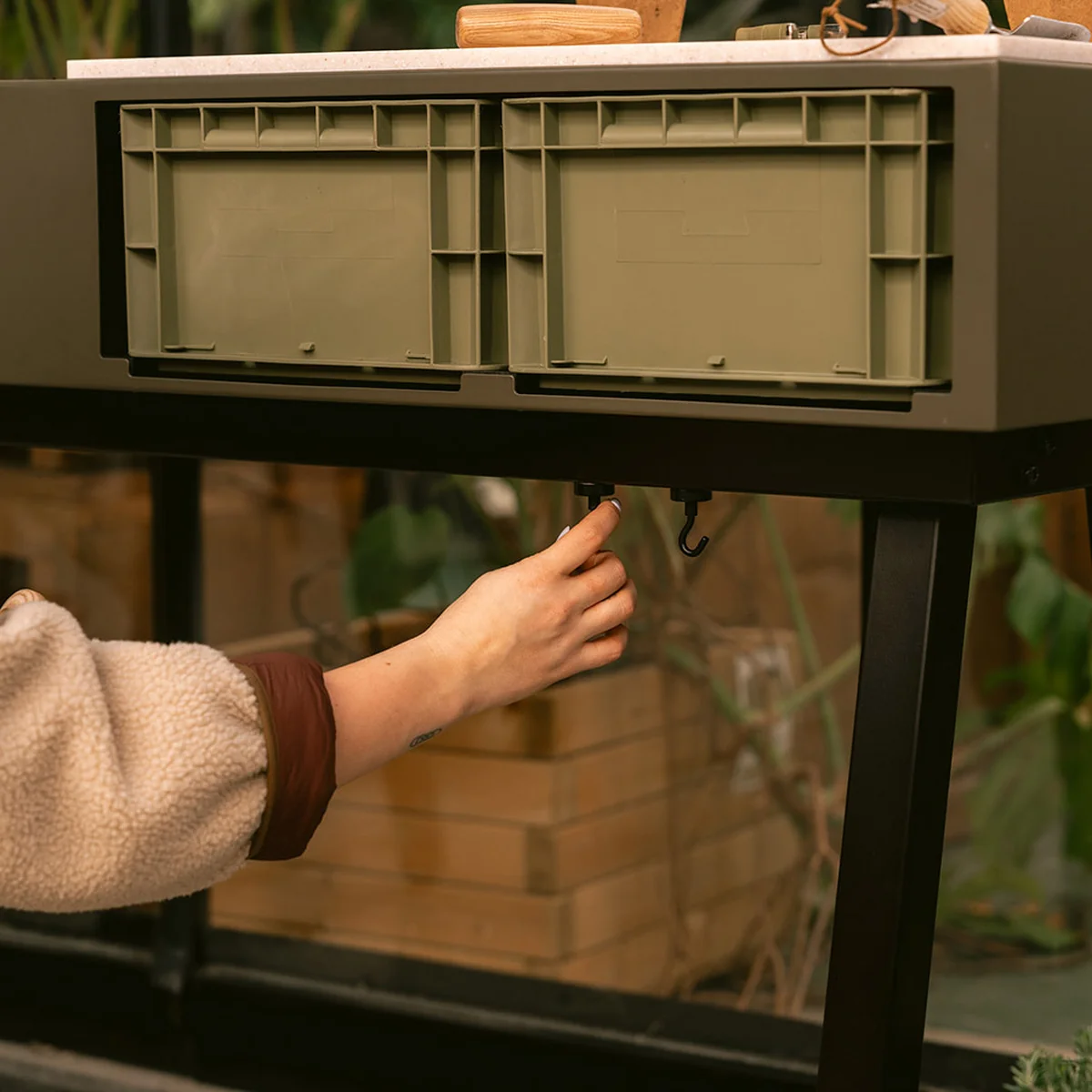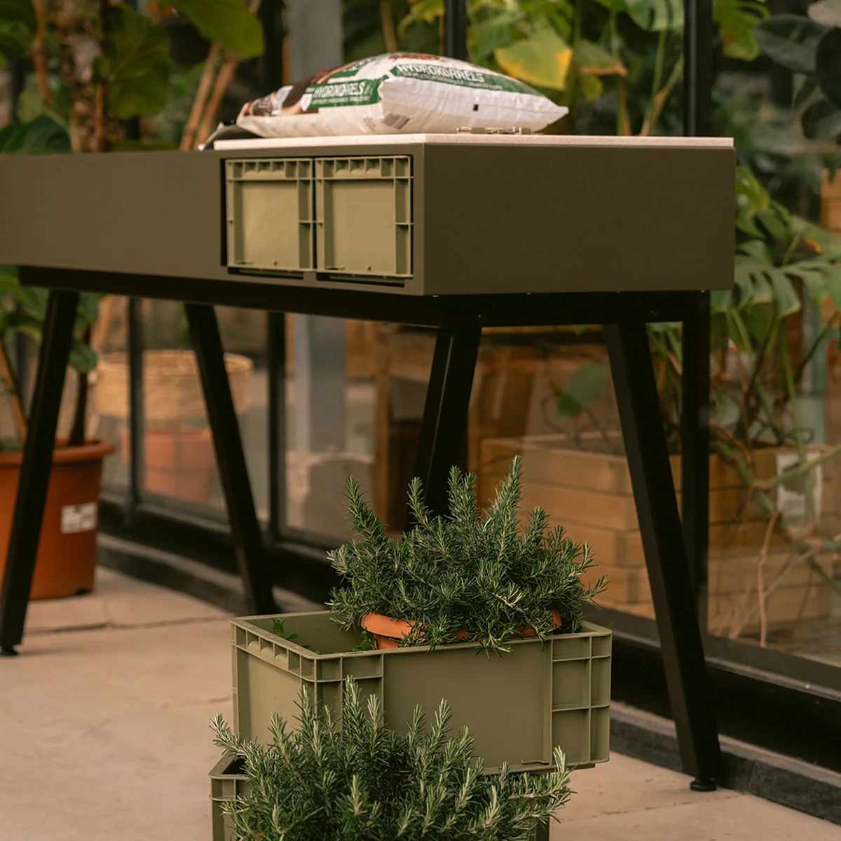 Het Gardenworks plantstation van Weltevree maakt tuinieren en buiten koken een intuïtief onderdeel van het dagelijks leven. In plaats van achteraan in de tuin te staan zoals traditionele groenten- en kruidenbedden, is het station bewust op een prominente plek geplaatst - direct naast de buitendeur als een natuurlijk verlengstuk van de keuken. Het meubel combineert een plantenbak met een royaal werkblad op een ergonomische hoogte van 93 cm, waardoor zowel het onderhoud van de tuin als de bereiding van verse ingrediënten aangenaam en gemakkelijk is. Twee bakken onder het werkblad zorgen voor extra opbergruimte. Het geïntegreerde irrigatiesysteem met twee drains houdt de bodem optimaal vochtig door overtollig water af te voeren en tegelijkertijd een constante waterlaag te behouden voor gezonde planten.