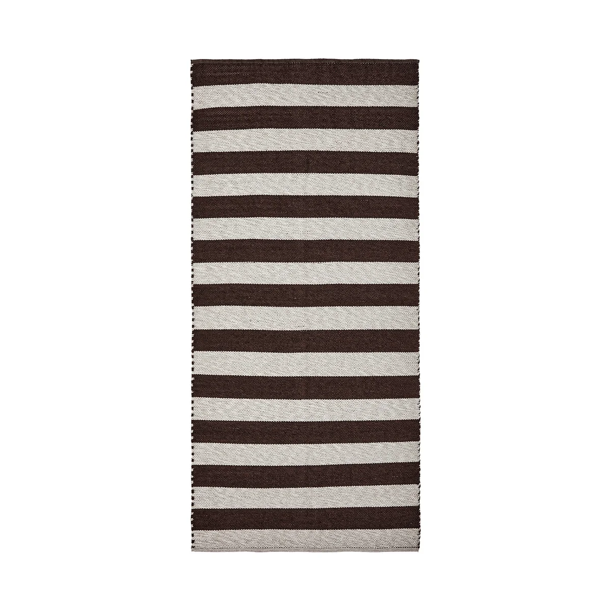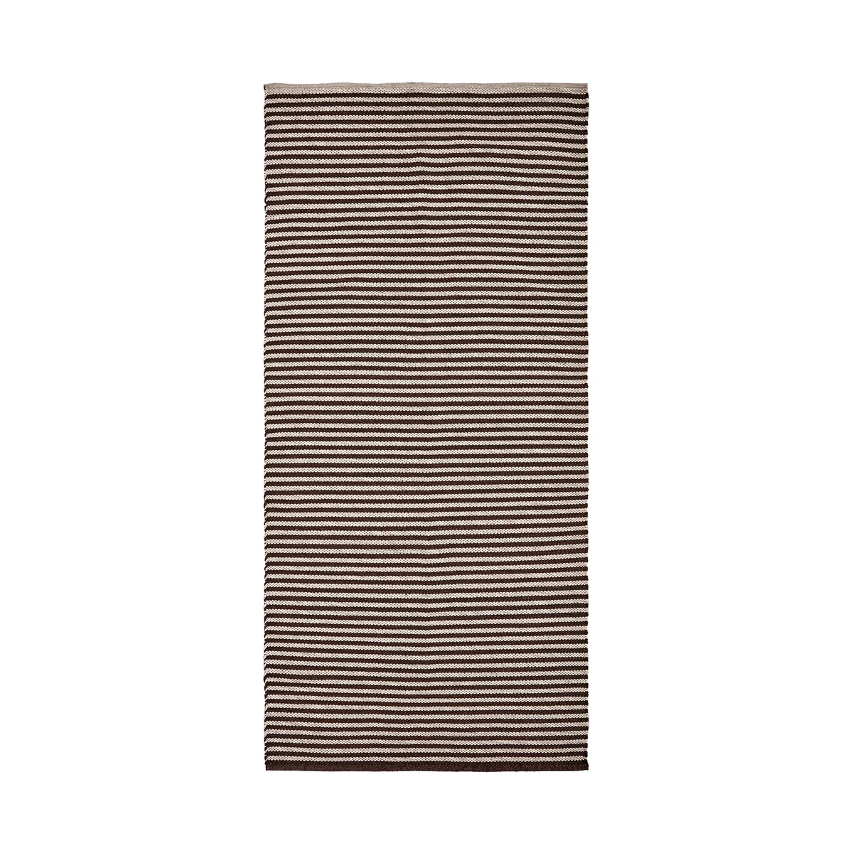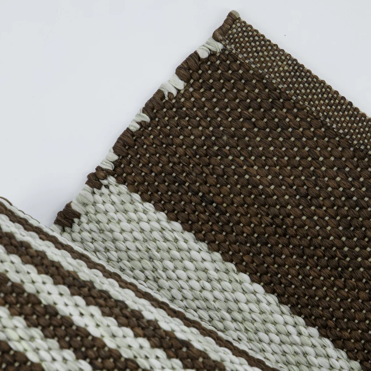 Het Alfo vloerkleed voor buiten combineert praktische functionaliteit met moderne elegantie. Het omkeerbare design heeft brede strepen aan de ene kant en smalle strepen aan de andere kant in natuurlijke en bruine tinten. Het is perfect voor patio's, balkons of oranjerieën en biedt een duurzame en weerbestendige oplossing voor je buitenruimte.