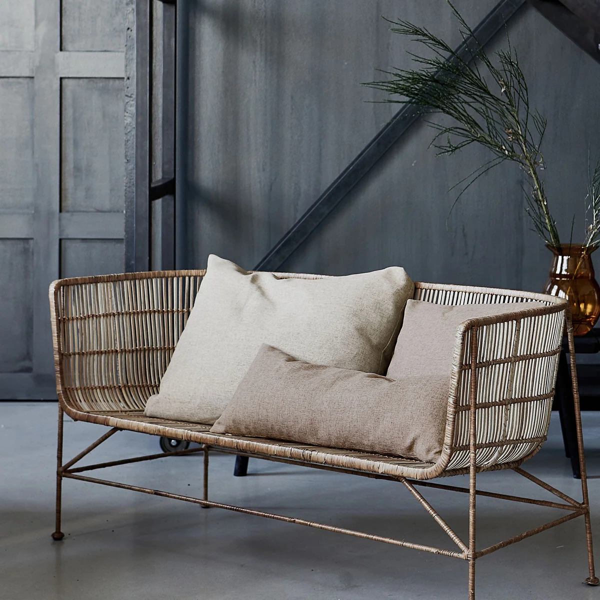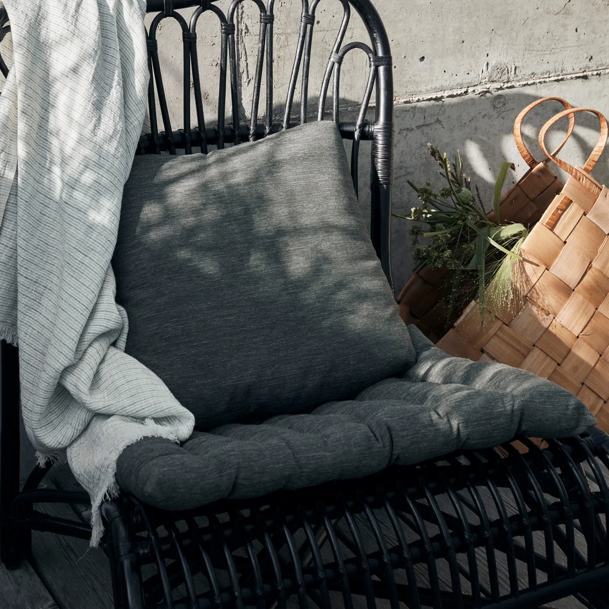 De designkussens zien er bijzonder stijlvol uit in combinatie met buitenmeubilair van beton en metaal.