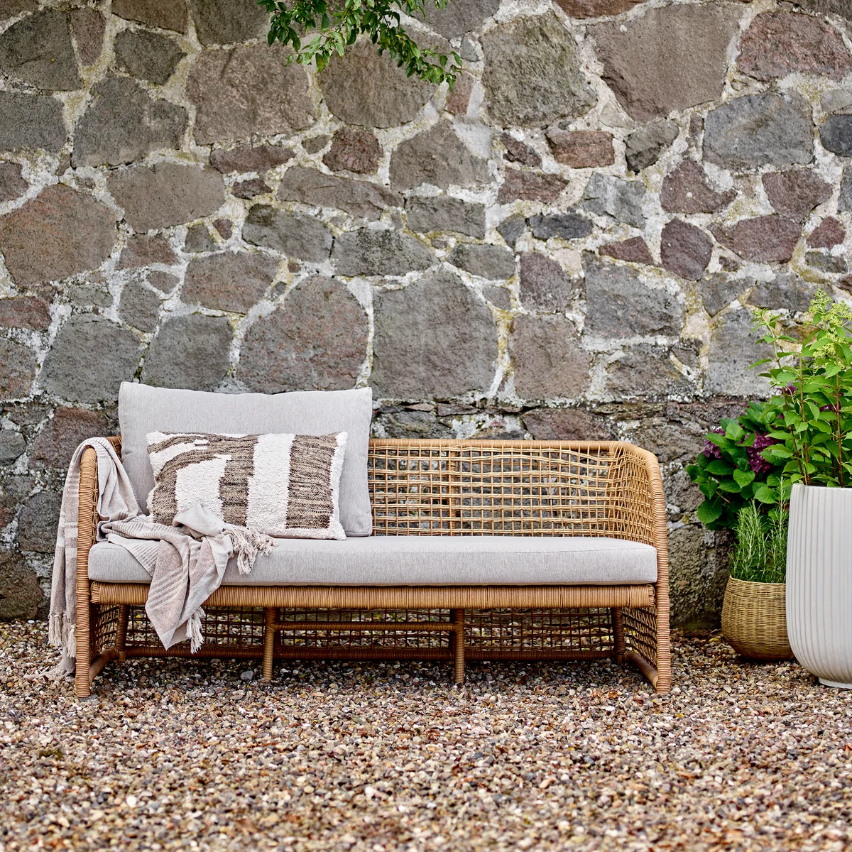 Met zijn luchtige poly-rattan ontwerp en zachte geweven kussens brengt de Penzano bank van Bloomingville een gezellige, uitnodigende sfeer in je buitenruimte. Hij is ideaal voor op het terras of in de tuin en nodigt uit om te ontspannen en te relaxen - ideaal in combinatie met andere natuurlijke materialen en texturen.