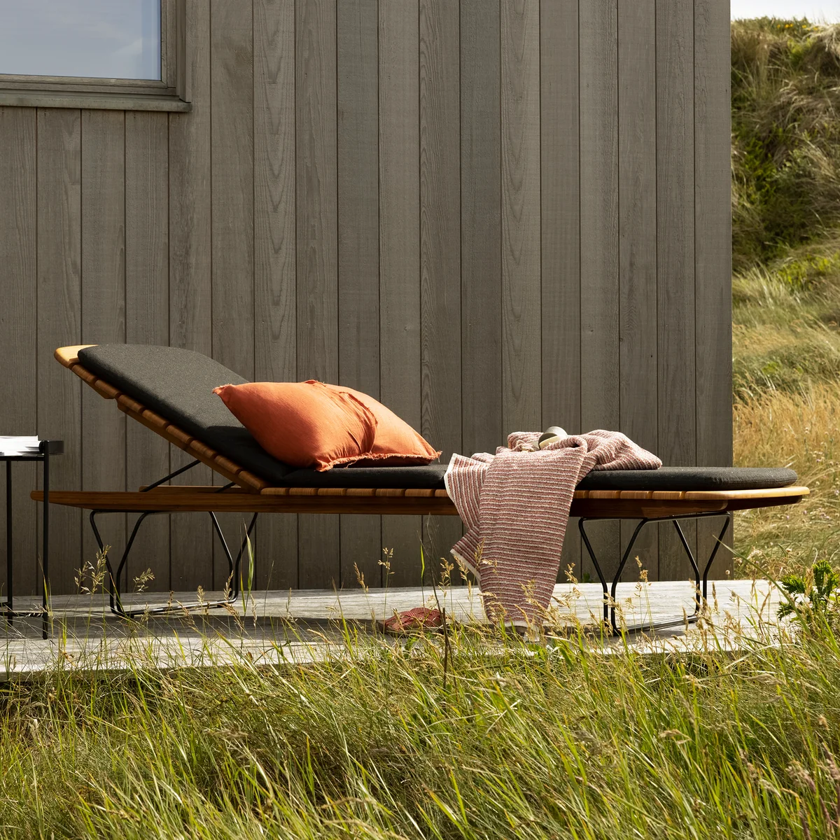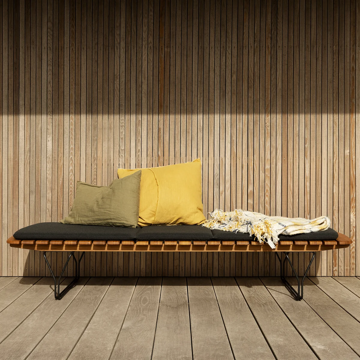 Hij wordt gekenmerkt door het ligoppervlak van zacht afgeronde bamboe latten, dat een warme, natuurlijke uitstraling heeft en tegelijkertijd een hoog comfortniveau biedt dankzij het gladde oppervlak. In combinatie met het stevige gepoedercoate metalen frame is het resultaat een harmonieus samenspel van lichtheid en robuustheid.