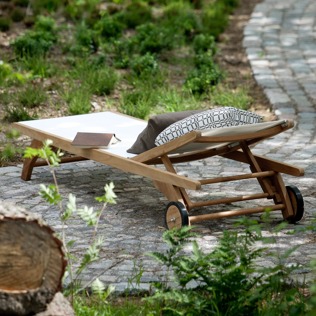 Het ontwerp van het Skagerak ligbed is rustig en discreet, met de gebogen poten die een vleugje dynamiek aan het ligbed toevoegen. Dit dynamisme is ook terug te vinden in het Sun Bed: Met de wielen aan het hoofdeinde kan het ligbed gemakkelijk van de ene plek naar de andere worden verplaatst.