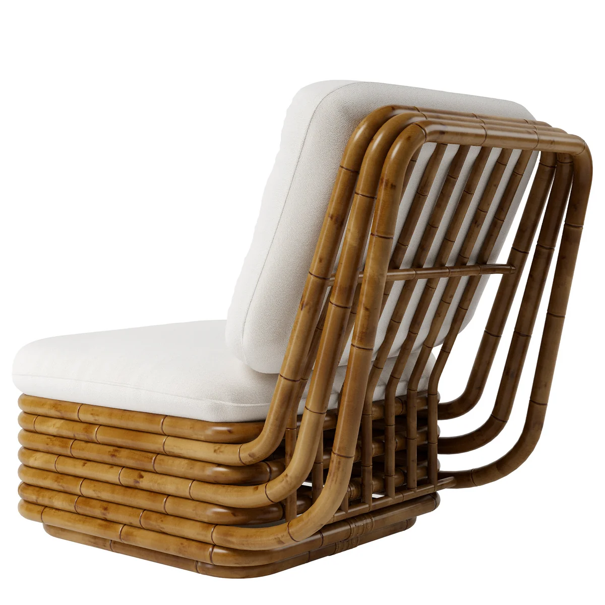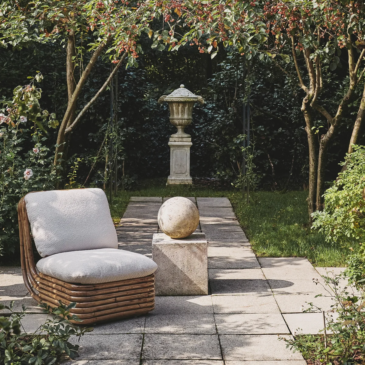 De Bohemian 72 Outdoor lounge stoel van de Deense fabrikant Gubi inspireert met zijn natuurlijke materialen. Hij is gemaakt van rotan en kan zowel binnen als buiten prachtig worden geplaatst en gebruikt. De bekleding van de zitting en rugleuning is gemaakt van exclusieve Cheveron Chenille-stof van de luxueuze fabrikant Dedar.