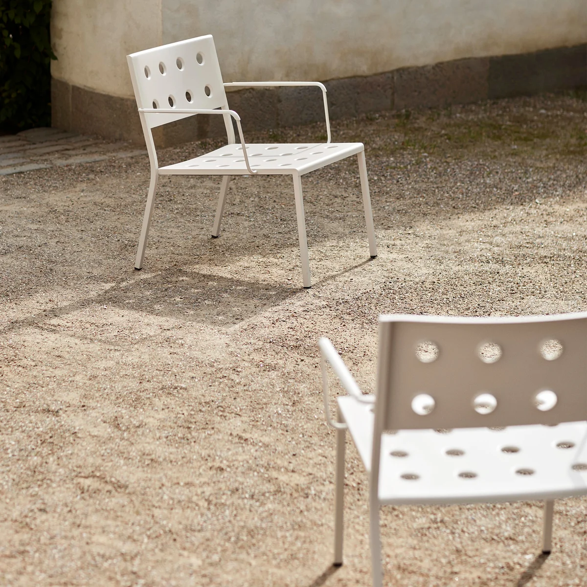 De Balcony Lounge fauteuil van Ronan en Erwan Bouroullec voor HAY is een elegante en functionele stoel met armleuningen. Het brede, vierkante ontwerp krijgt een zachtere uitstraling door de afgeronde rugleuning en armleuning. De gaten in de zitting en de rugleuning geven de constructie stabiliteit en zorgen tevens voor een bijzondere expressie. De Balcony Lounge fauteuil is gemaakt van gepoedercoat staal met een coating die weerstand en duurzaamheid garandeert, waardoor hij ideaal is voor gebruik buitenshuis.